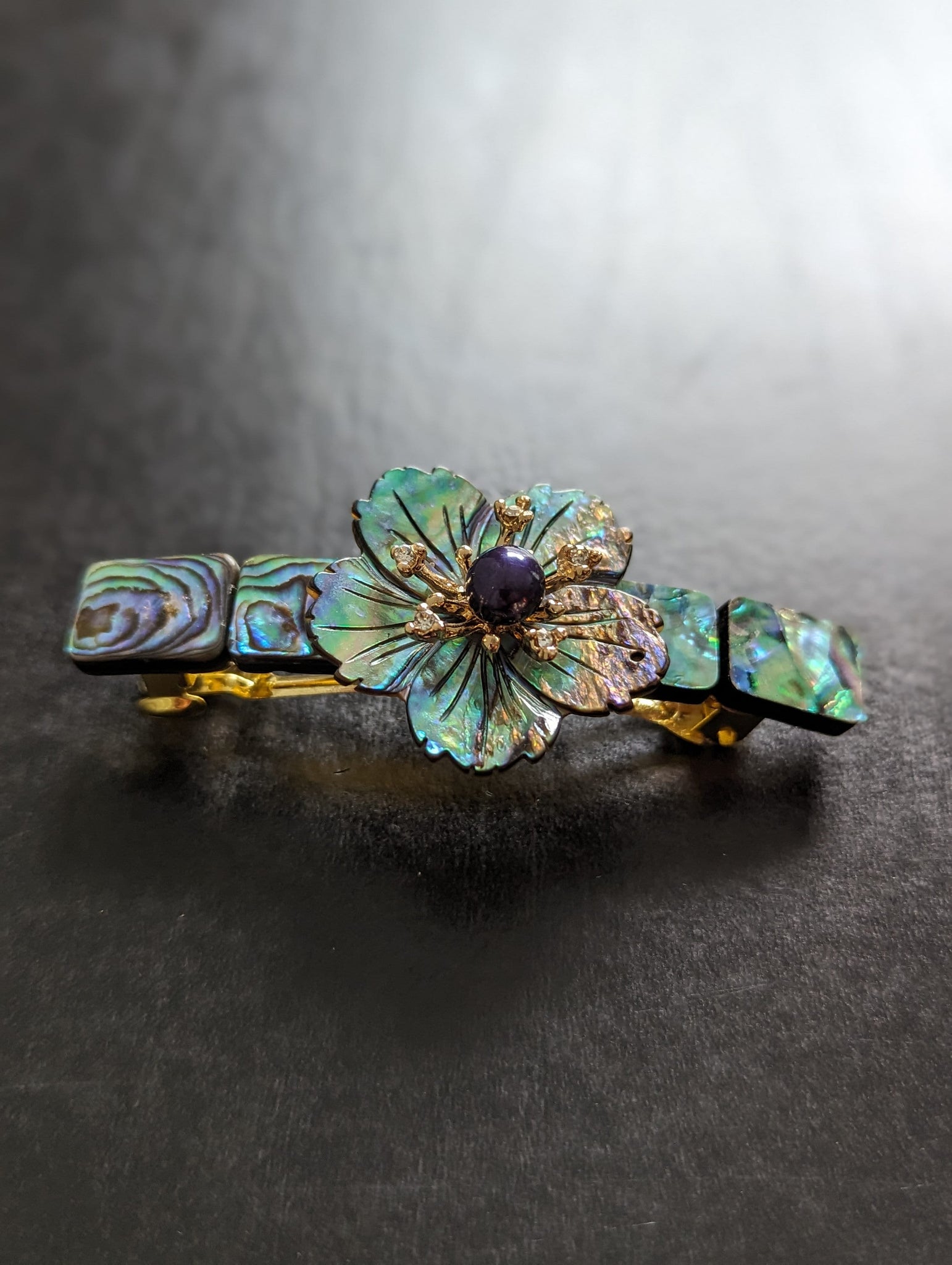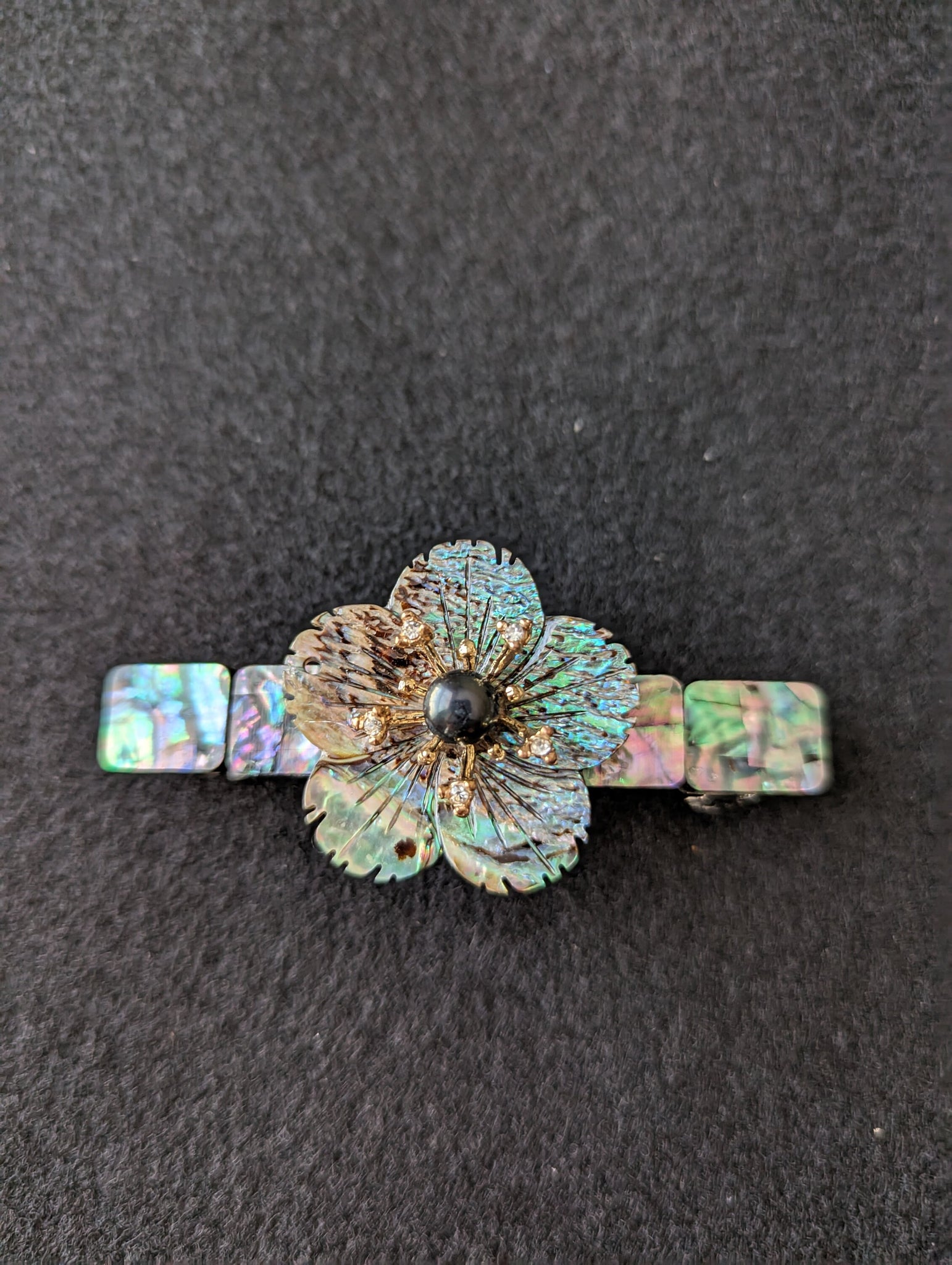 This beautiful crafted hair barrette, features a Abalone Flower center piece with 7 medium rectangular abalone stones mounted on a 3 inch french metal hair barrette