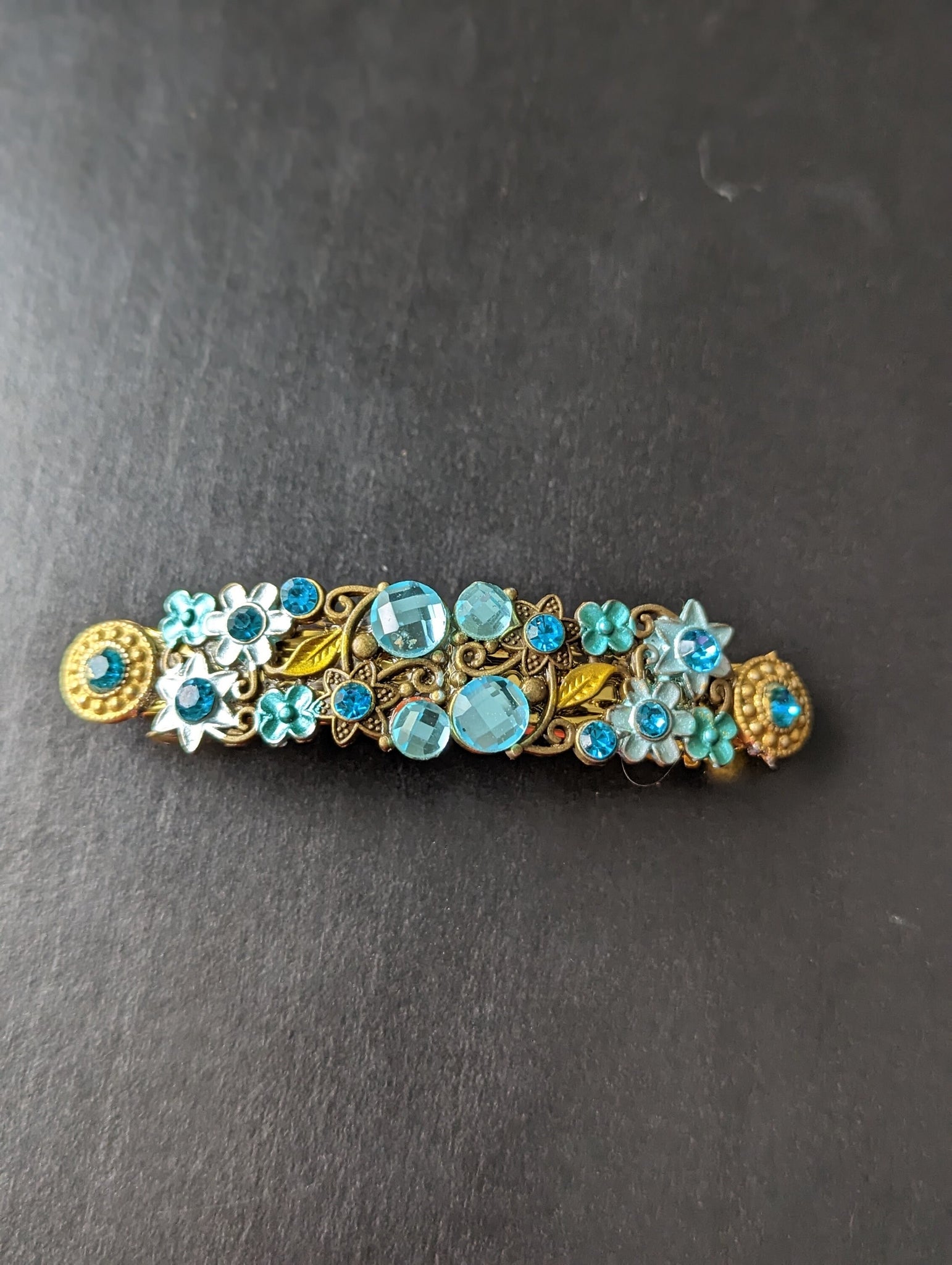Designed with two rectangler floral metal pieces and glass beads mounted on a large metal hair barrette.