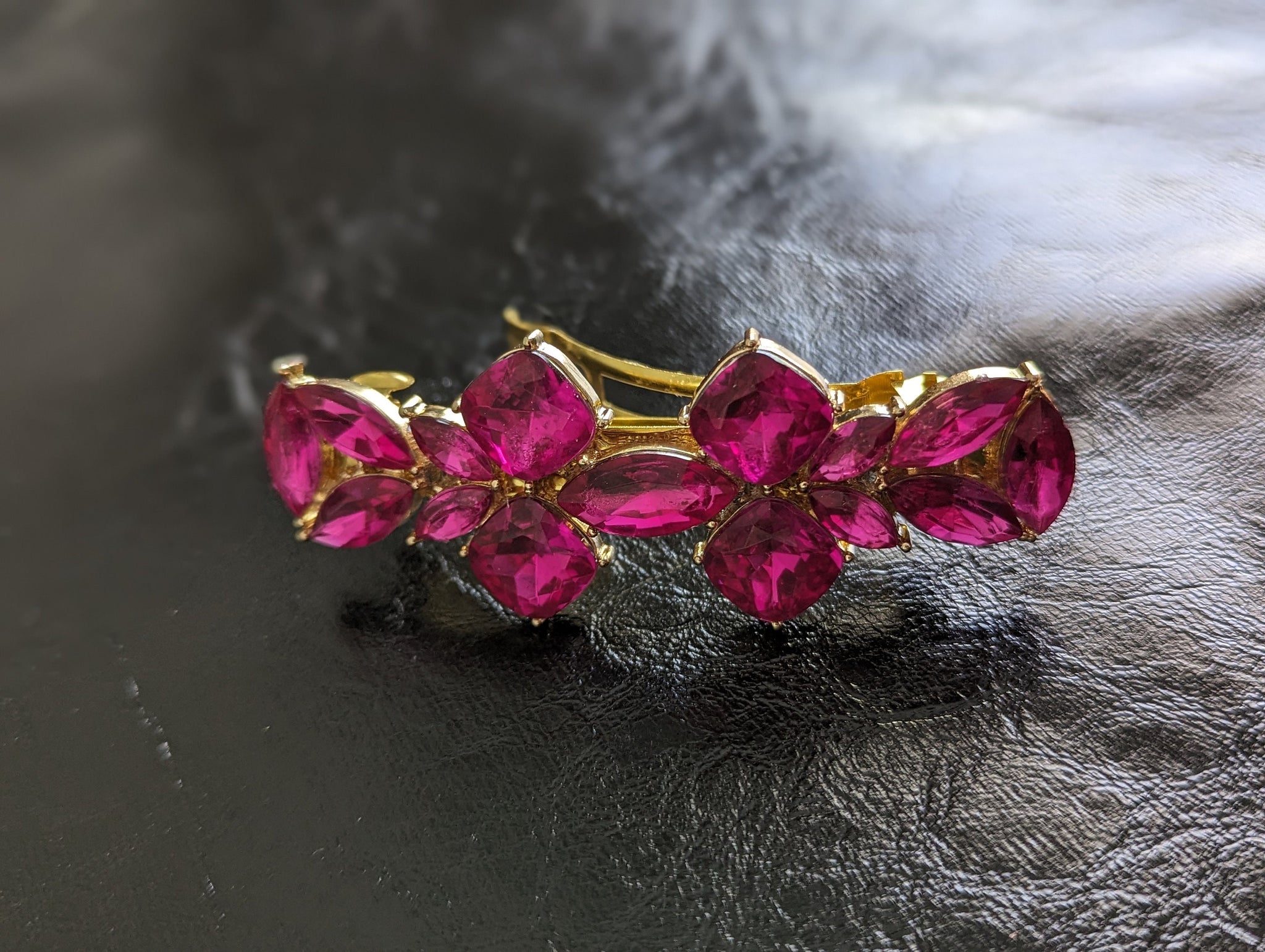 The hot pink rhinestones on this hair barrette gleam with a vibrant intensity against the backdrop of its lustrous gold tone. Each rhinestone, meticulously faceted to catch and reflect light, adds a touch of brilliance and allure. Set against the radiant gold tone, the hot pink hue exudes a captivating energy, infusing any hairstyle with a pop of bold color and glamour.