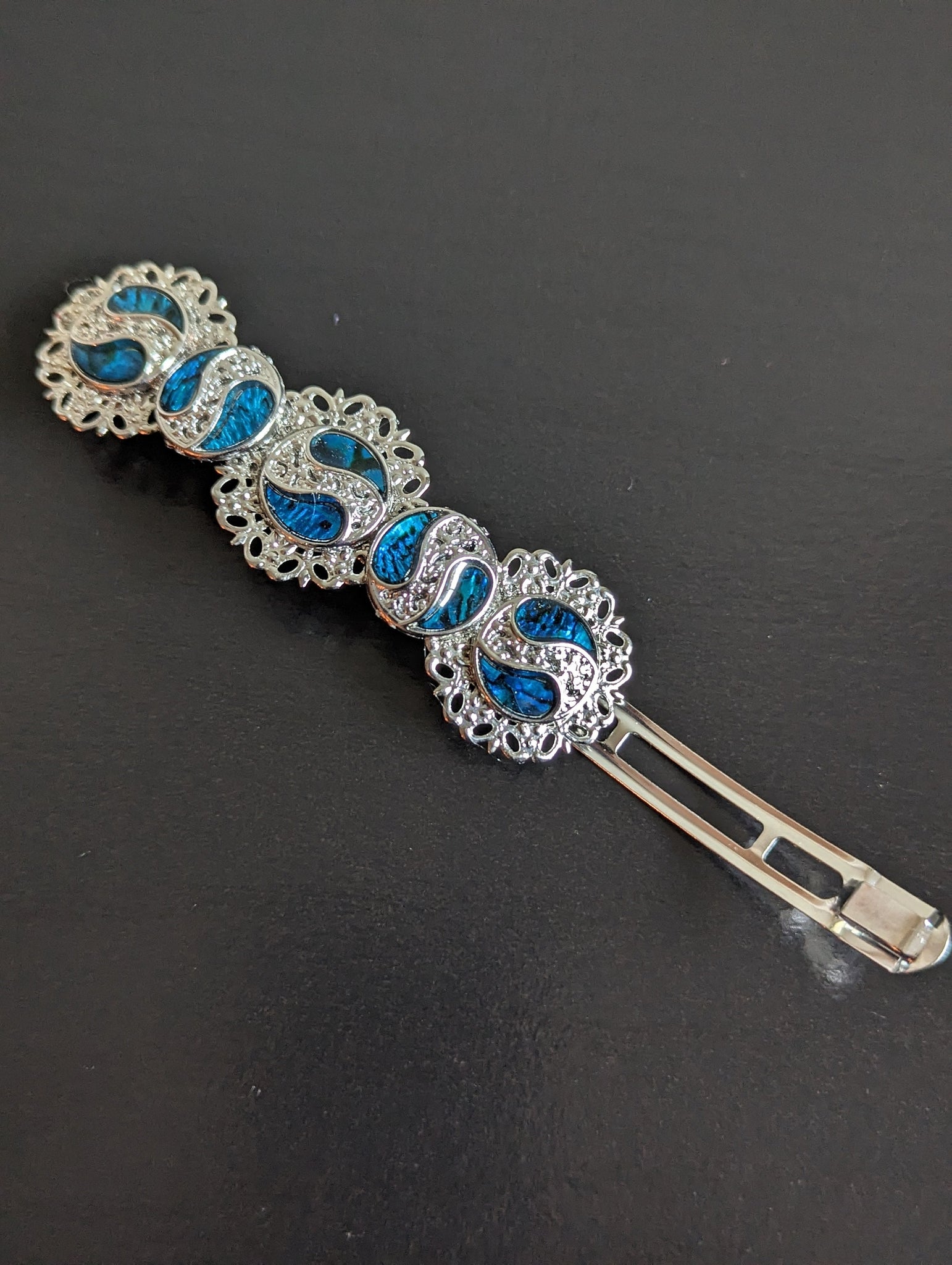 Adorning the barrette are swirls of beads made from blue and silver shell material. The blue shells contribute a tranquil and oceanic hue, reminiscent of the sea, while the silver shells add a touch of metallic brilliance. The swirl pattern is likely arranged in an artful and dynamic manner, creating a sense of movement and visual interest.