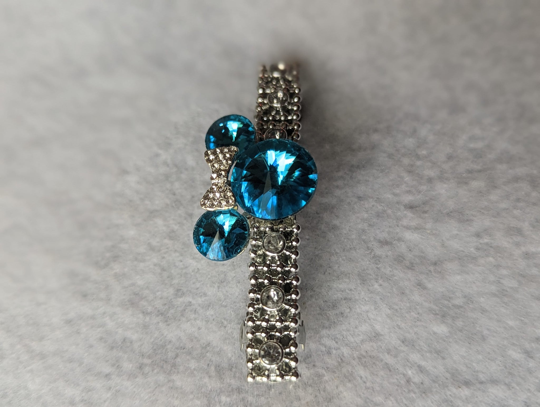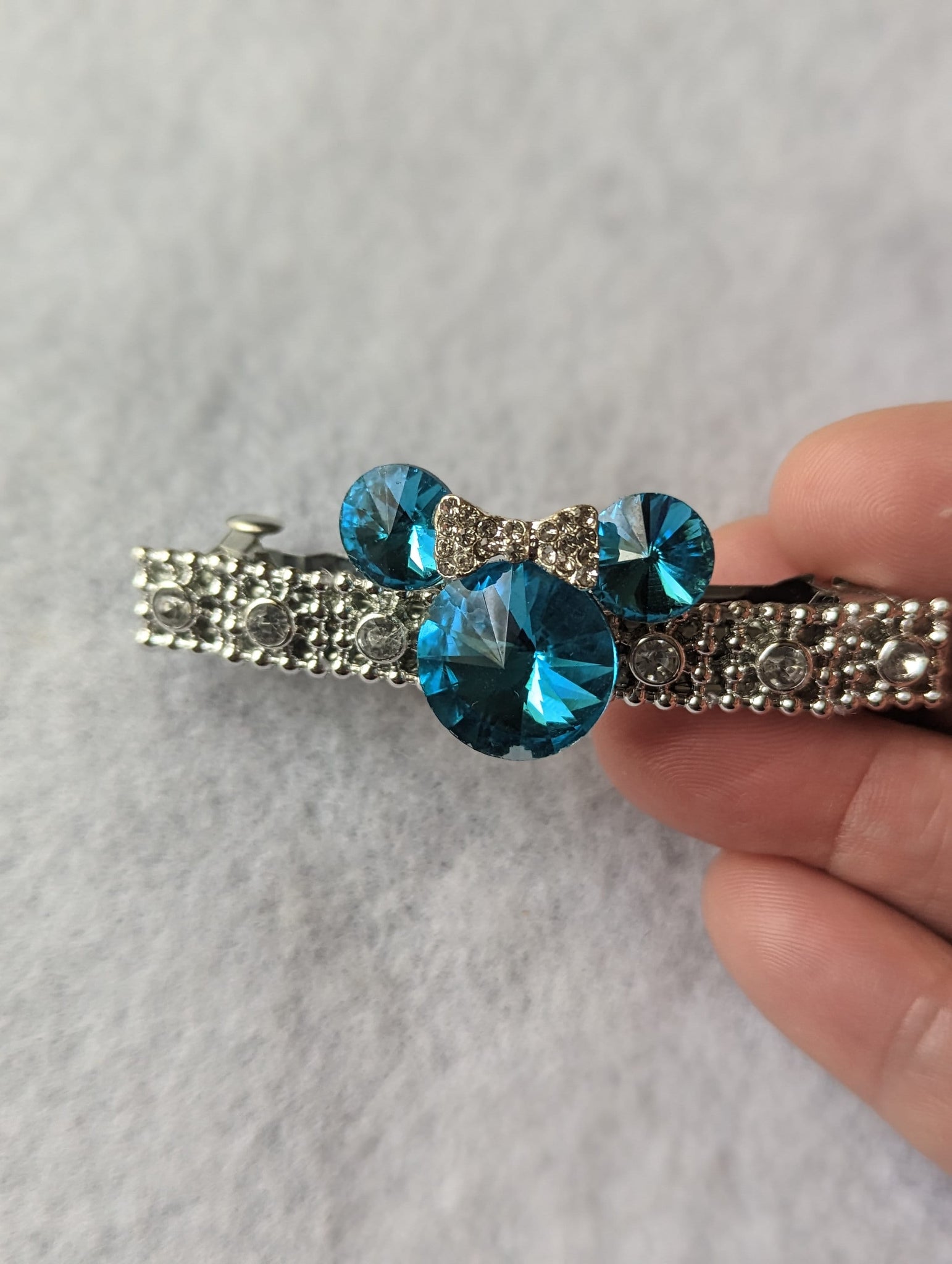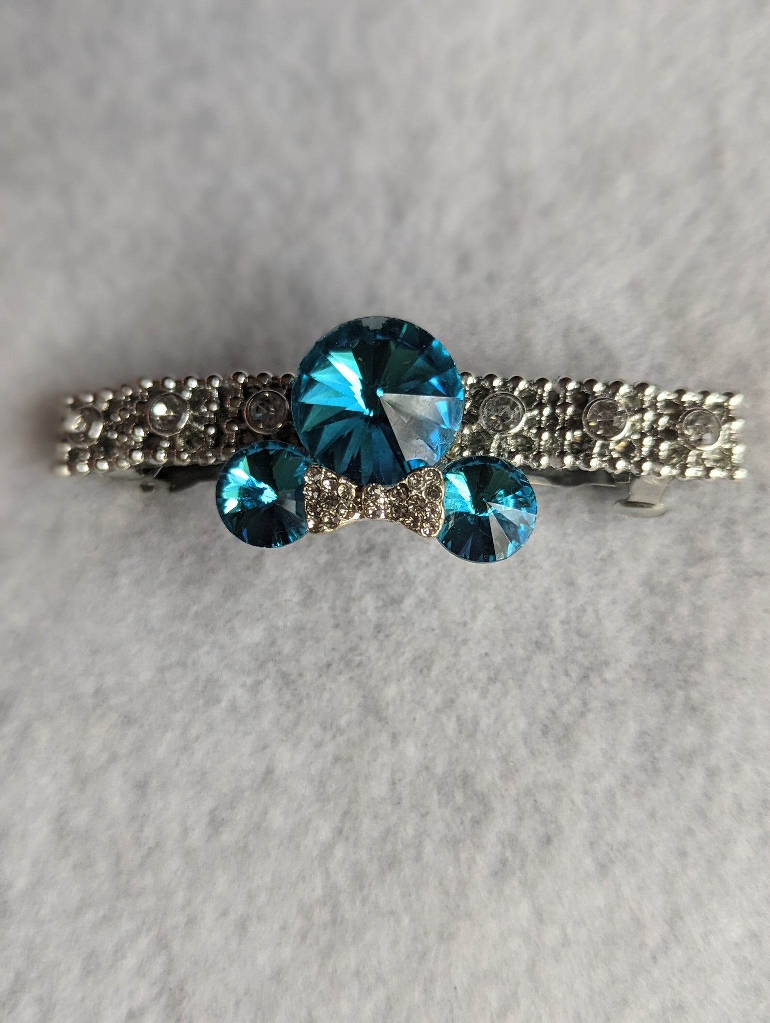 A teal blue Minnie Mouse ears rhinestone barrette is a stunning and whimsical hair accessory inspired by the iconic Disney character, Minnie Mouse. The barrette features a pair of ears resembling Minnie's signature look, crafted in a vibrant teal blue color. Each ear is adorned with sparkling rhinestones that catch the light, adding a touch of glamour and playfulness.