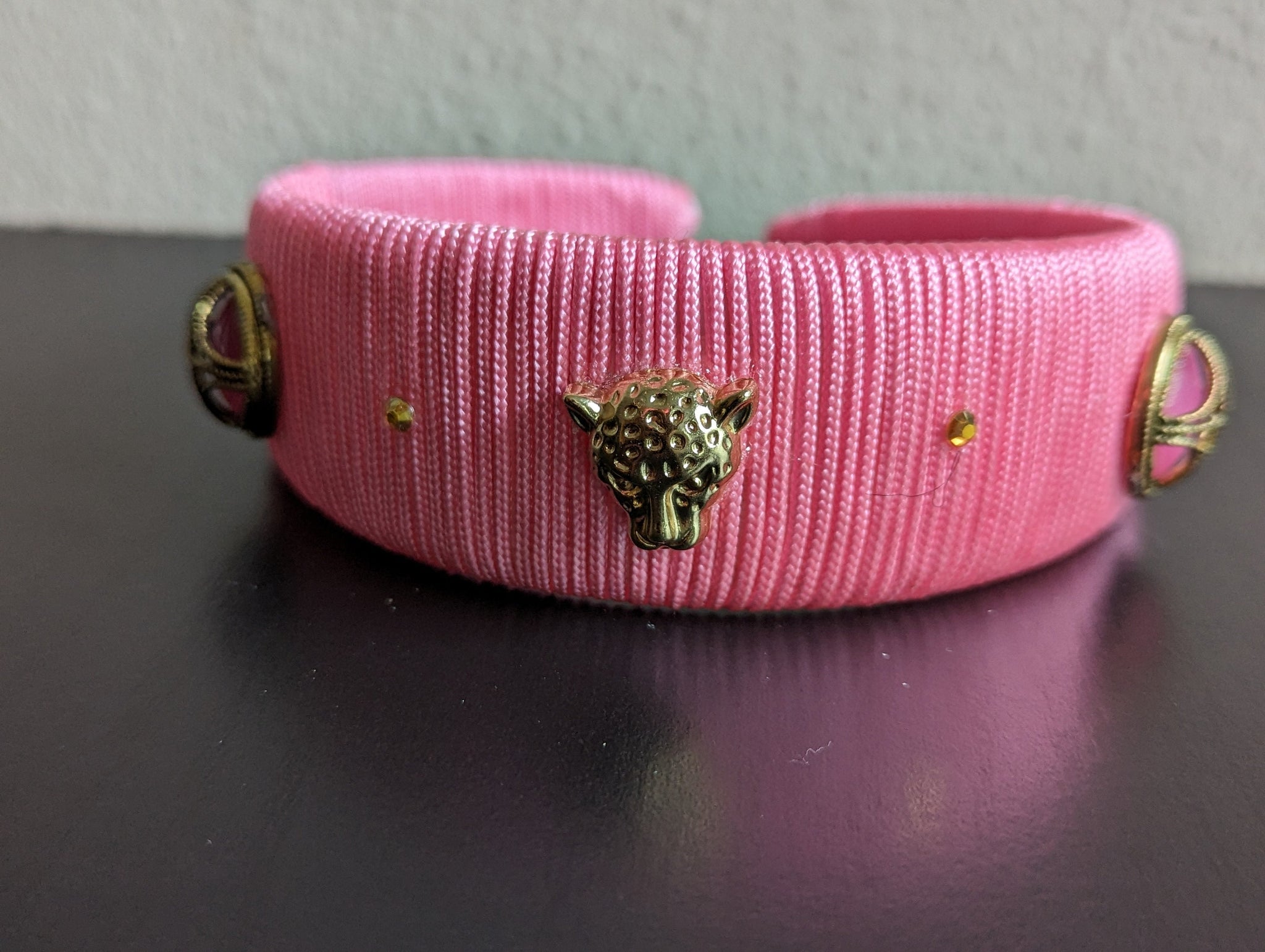 A pink Beaded Headband with Gold Tone Leopard is a chic and stylish hair accessory that combines the sweetness of pink beads with the opulence of gold accents.