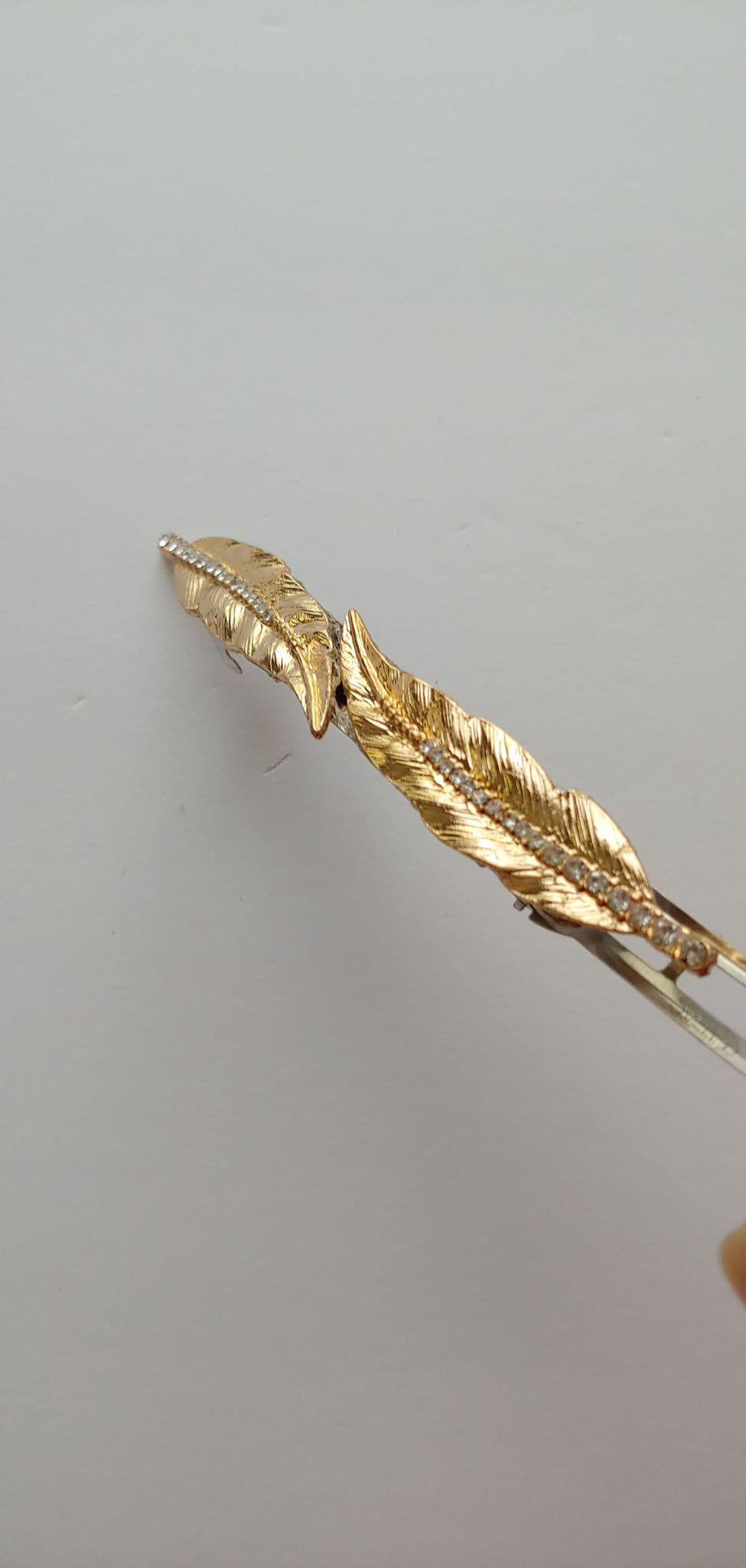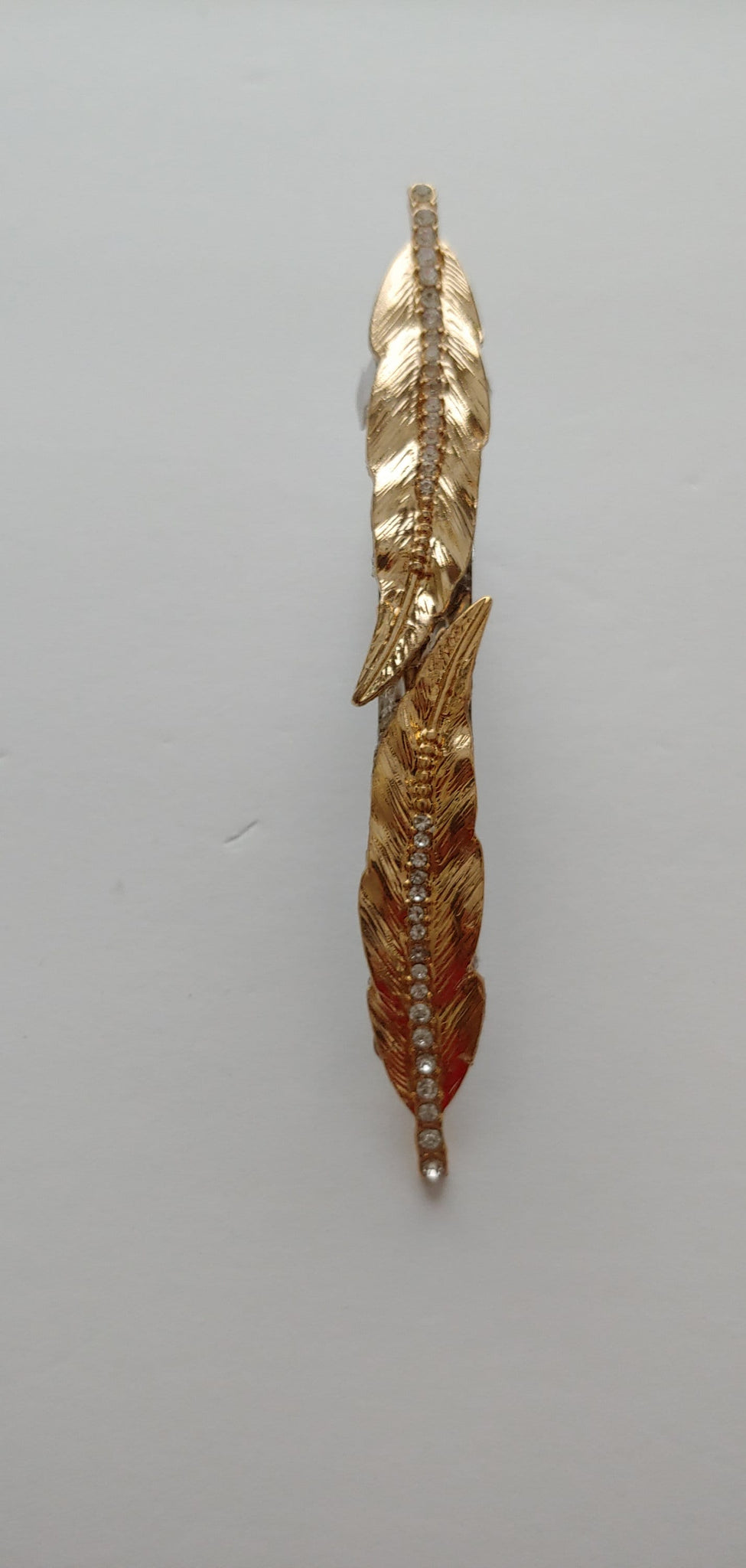 Enjoy sporting this Golden Feather Rhinestone Barrette. It features two lovely feathers shape with a center of clear rhinestones mounted a 3 inch french metal barrette.