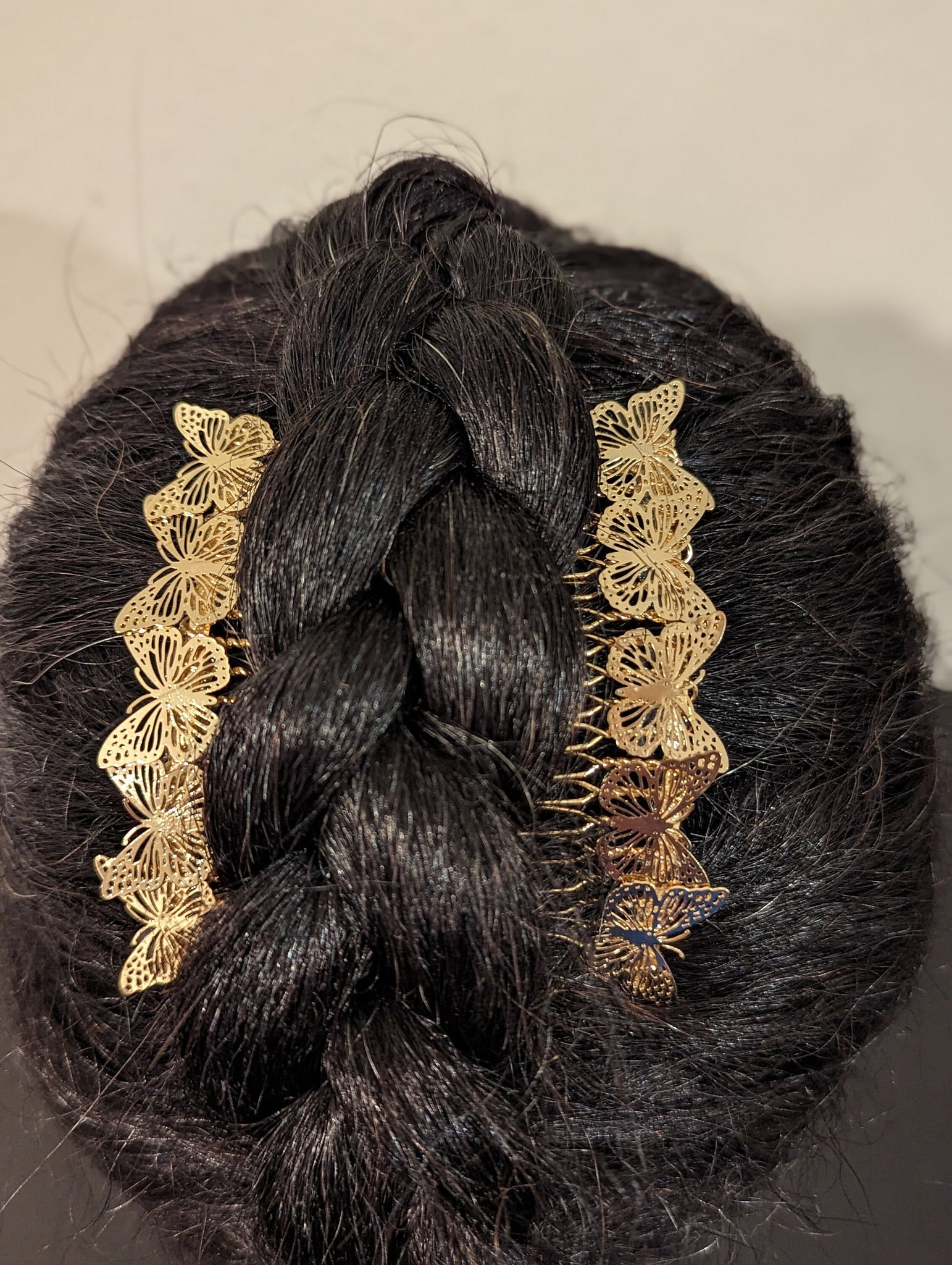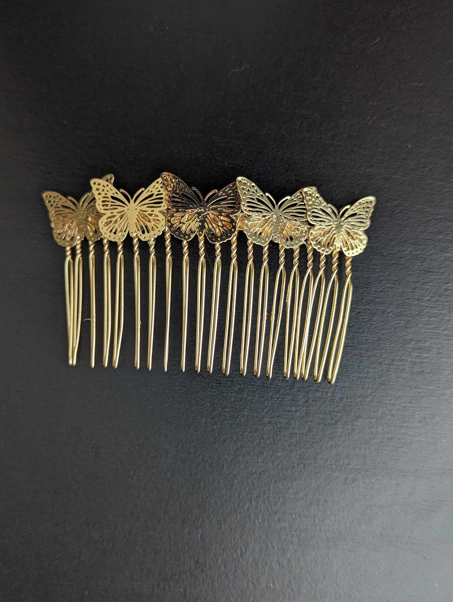 This danty little hair comb is designed with 5 small well crafted butterflies mounted on a 3 inch goldtone metal hair comb.