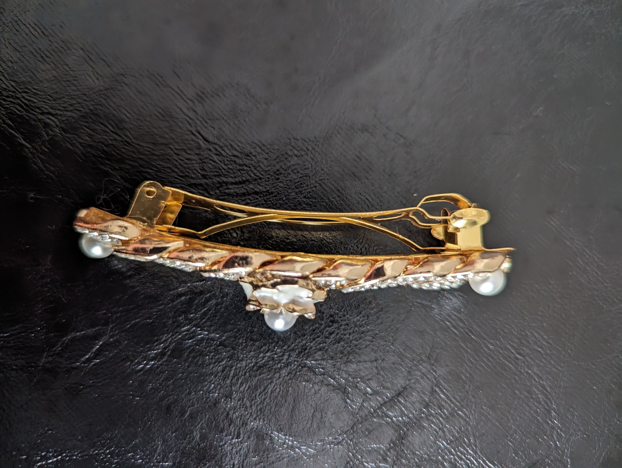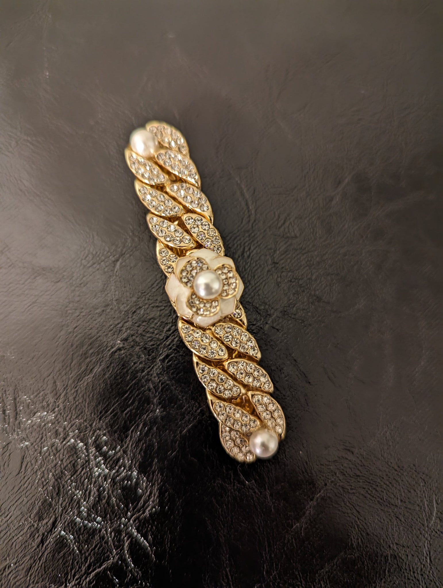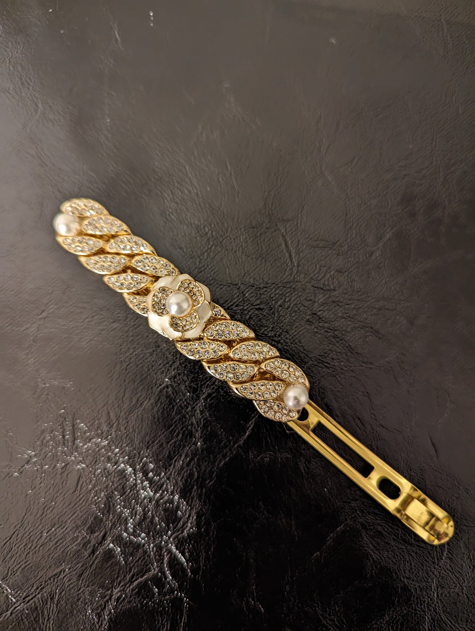 This exquisite hair barrette features a gold-tone chain link design interspersed with clear rhinestones and lustrous pearls, adding a classic yet glamorous touch to any hairstyle. The combination of sparkling rhinestones and elegant pearls creates a sophisticated accessory that's perfect for both special occasions and everyday elegance.