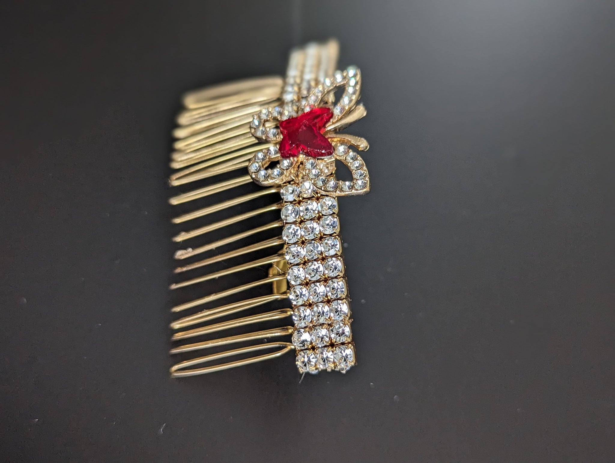The Gold-tone Red & Clear Butterfly Rhinestone Hair Comb is a stunning accessory crafted to elevate any hairstyle with elegance and charm. Adorned with delicate red and clear rhinestones, this hair comb features a graceful butterfly design set against a radiant gold-tone backdrop. Perfect for adding a touch of sophistication to summer looks or as exquisite wedding hair jewelry, it's a versatile piece that exudes timeless beauty. Whether worn for special occasions or to elevate everyday styles, this accessory is sure to dazzle and captivate.