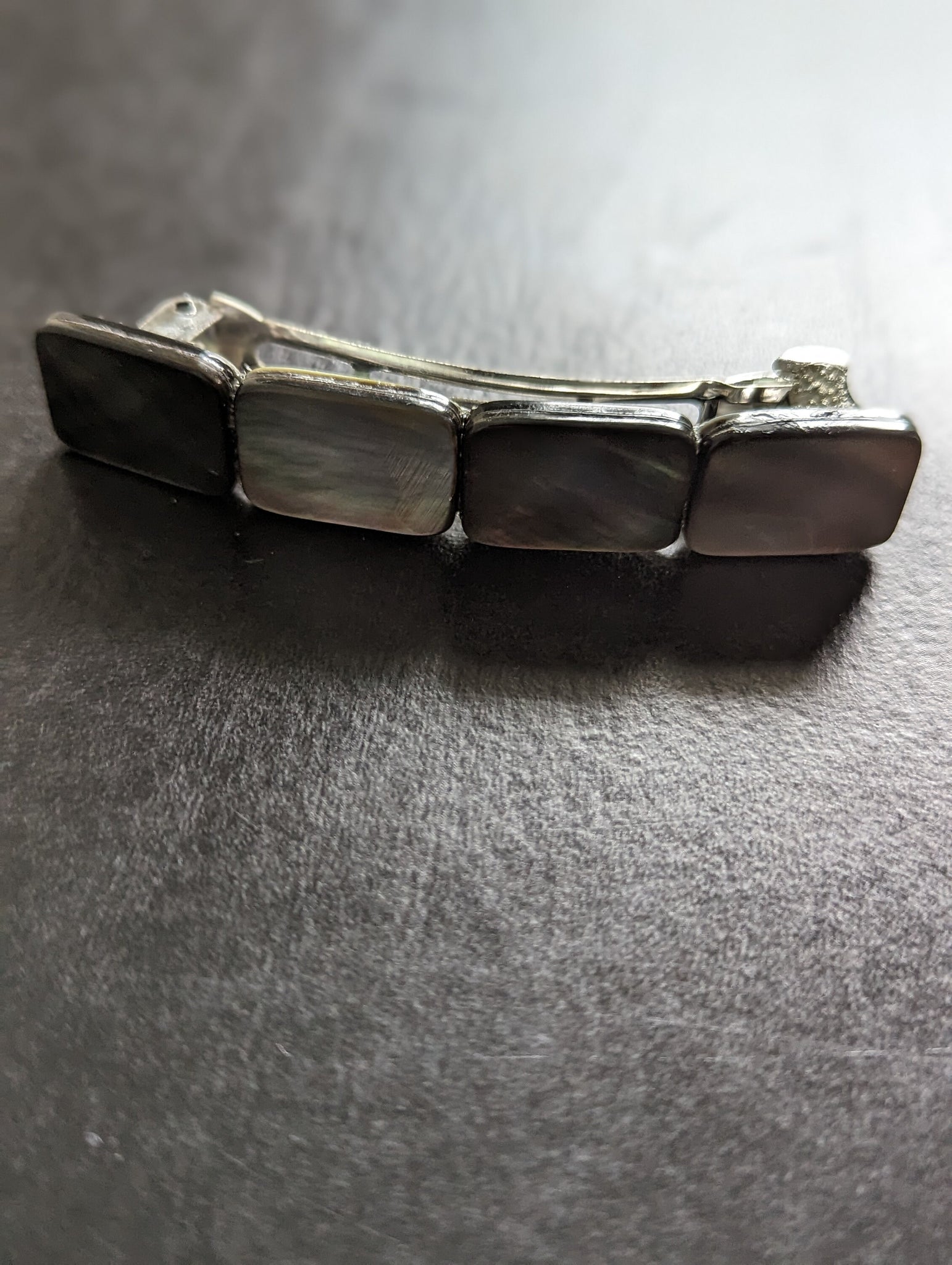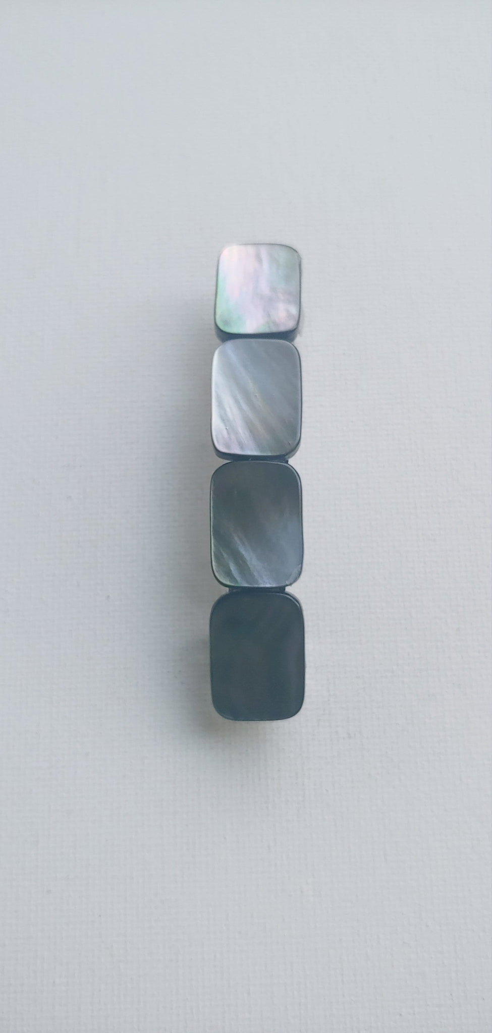 This barrette is designed with four natural shell beads mounted on a large 3 inch metal hair barrette. Can be worn with different hues of gray or black.