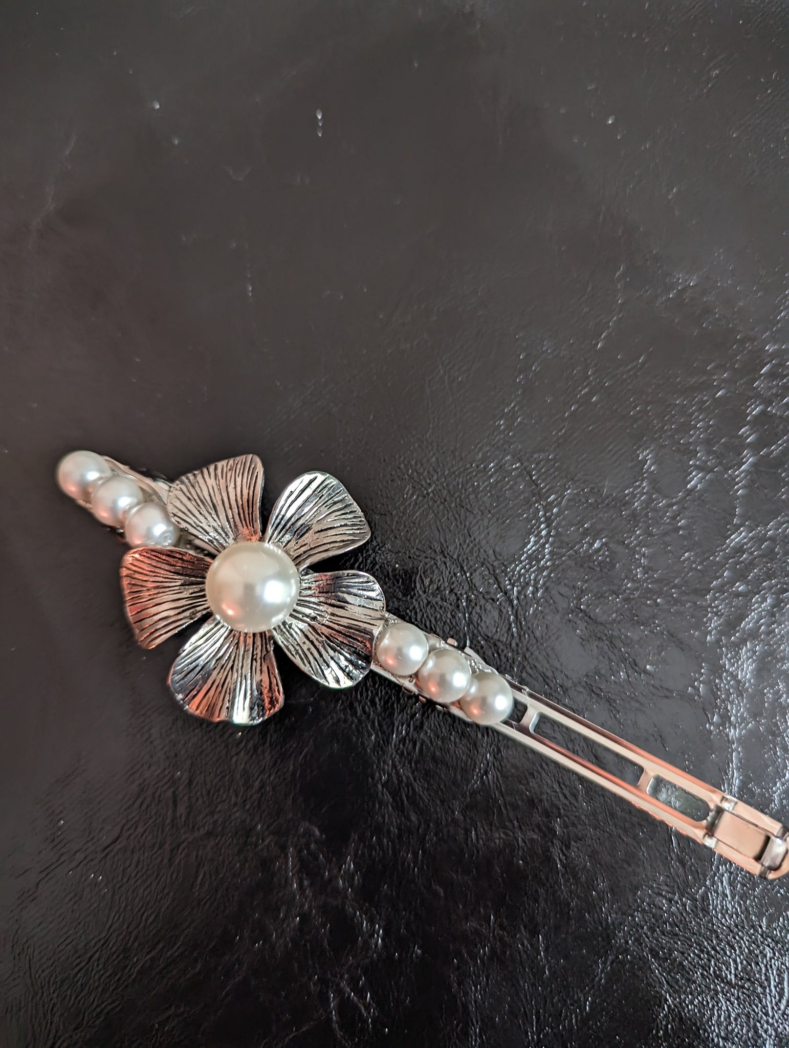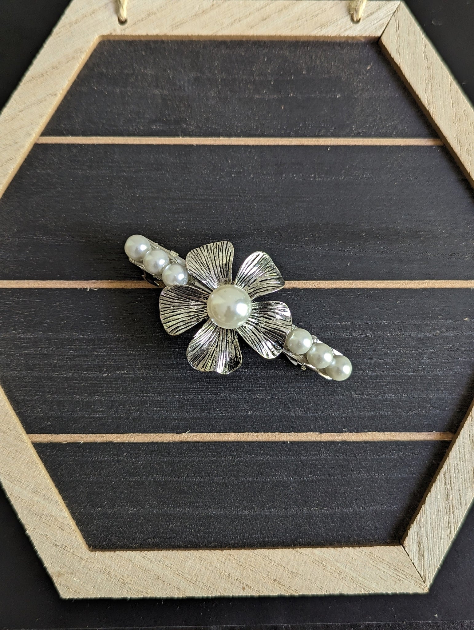 This uniquely handmade silver flower, accented with a lustrous pearl at its center and adorned with medium pearl beads, exudes an exquisite charm. Crafted with meticulous care and attention to detail, each petal of the flower is delicately formed to create a captivating silhouette. The focal point, a radiant pearl nestled in the heart of the bloom, adds a touch of elegance and sophistication. Surrounding it, the medium-sized pearl beads enhance the floral design, lending it a timeless allure. This artisanal masterpiece is not just an accessory but a symbol of refined taste and enduring beauty, perfect for adding a touch of glamour to any ensemble.
