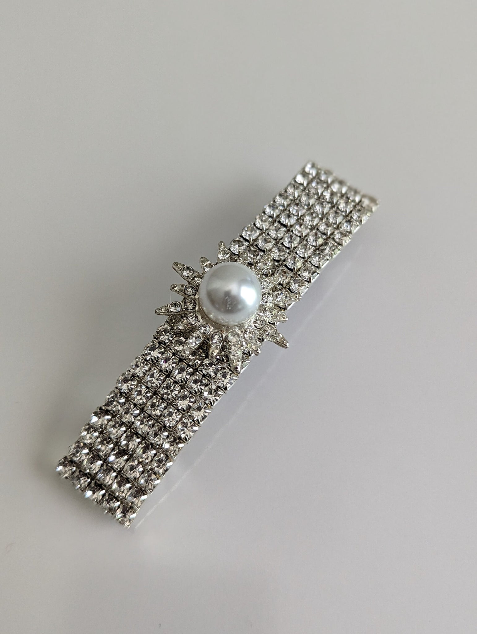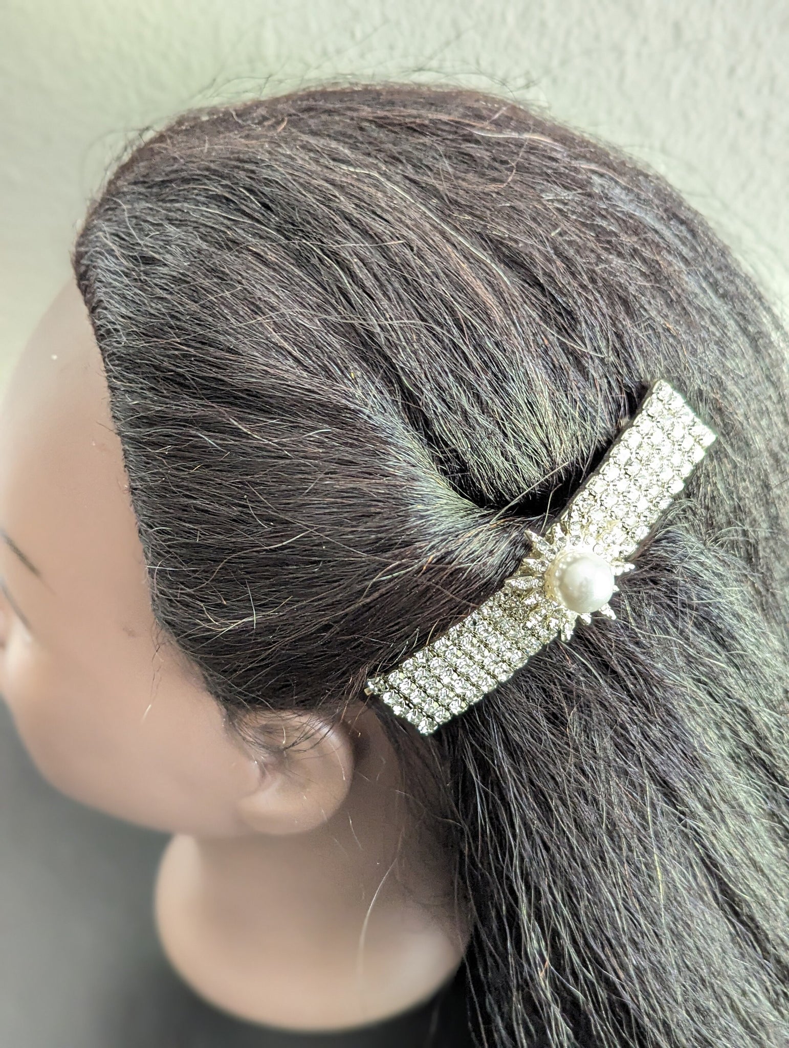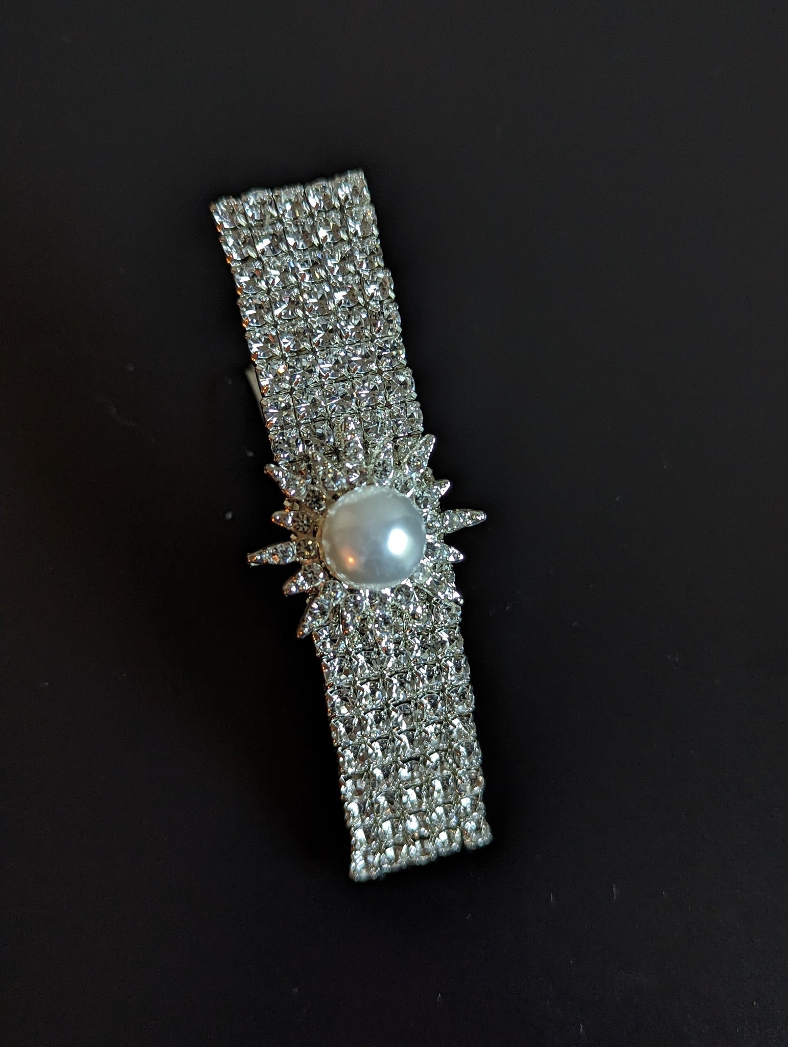 The Pearl & Clear Rhinestone Barrette exudes timeless elegance and sophistication. This exquisite hair accessory features a classic design adorned with a lustrous pearl and shimmering clear rhinestones. The combination of this pearl and rhinestones adds a touch of glamour to any hairstyle, effortlessly elevating your look for special occasions or everyday wear. With its sturdy barrette clasp, it securely holds hair in place while adding a luxurious finishing touch to your ensemble. Perfect for adding a touch of refined beauty to any hairstyle with its timeless appeal.