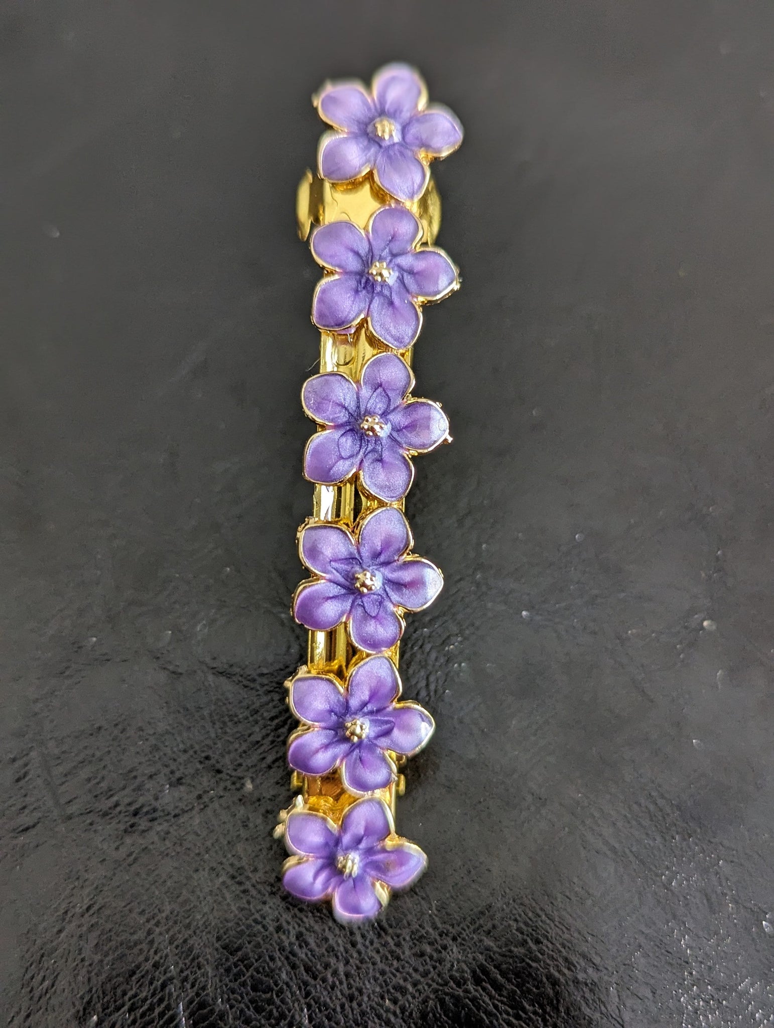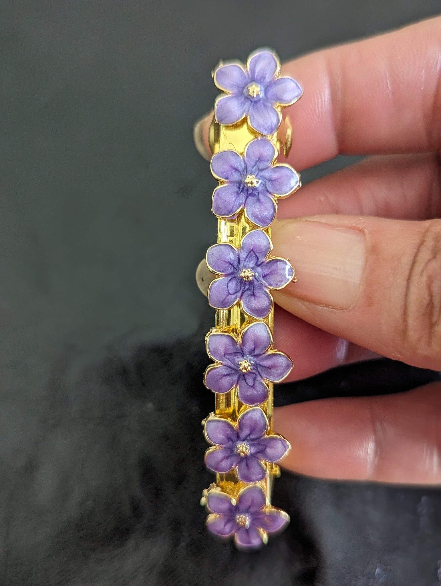 These purple and gold flower barrettes are a stunning accessory designed to add a touch of elegance to any hairstyle. Crafted with meticulous attention to detail, each barrette features a vibrant purple flower with delicate gold accents. The petals are intricately formed to create a lifelike bloom, while the gold detailing adds a touch of luxury and sophistication. These barrettes are not only stylish but also functional, securely holding hair in place with ease. Whether worn individually or paired together for a statement look, these exquisite accessories are perfect for adding a pop of color and glamour to any outfit.