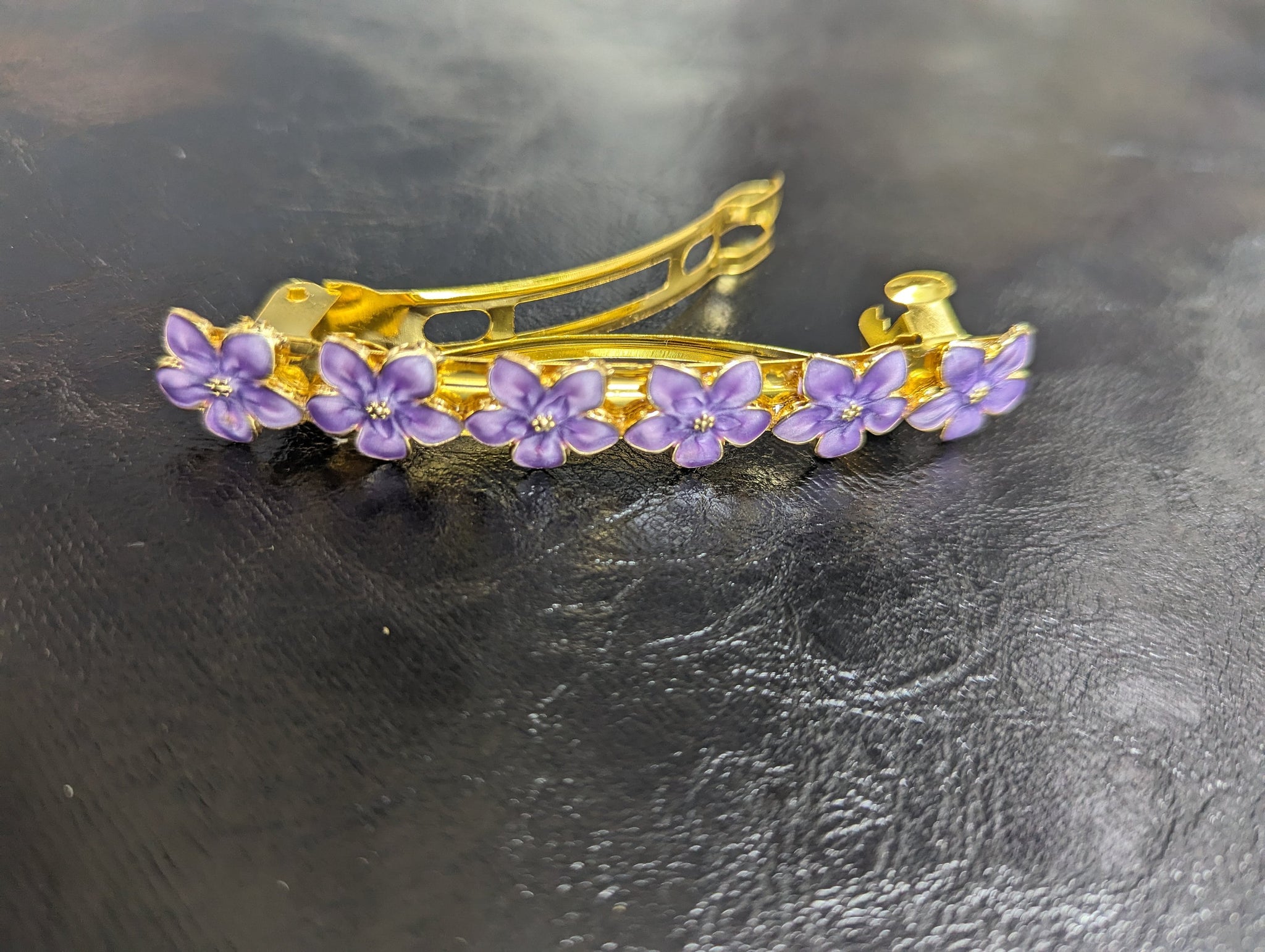 These purple and gold flower barrettes are a stunning accessory designed to add a touch of elegance to any hairstyle. Crafted with meticulous attention to detail, each barrette features a vibrant purple flower with delicate gold accents. The petals are intricately formed to create a lifelike bloom, while the gold detailing adds a touch of luxury and sophistication. These barrettes are not only stylish but also functional, securely holding hair in place with ease. Whether worn individually or paired together for a statement look, these exquisite accessories are perfect for adding a pop of color and glamour to any outfit.