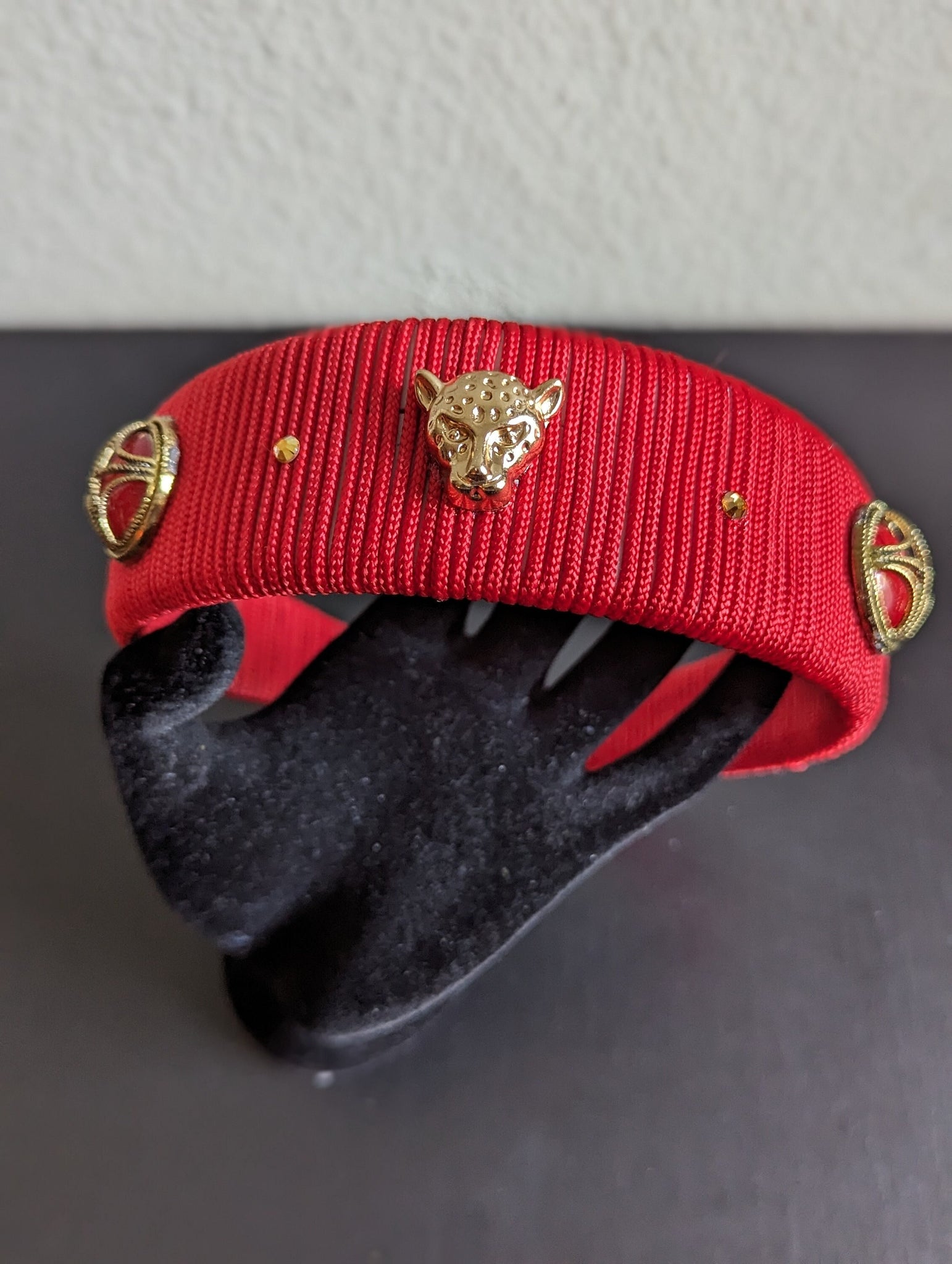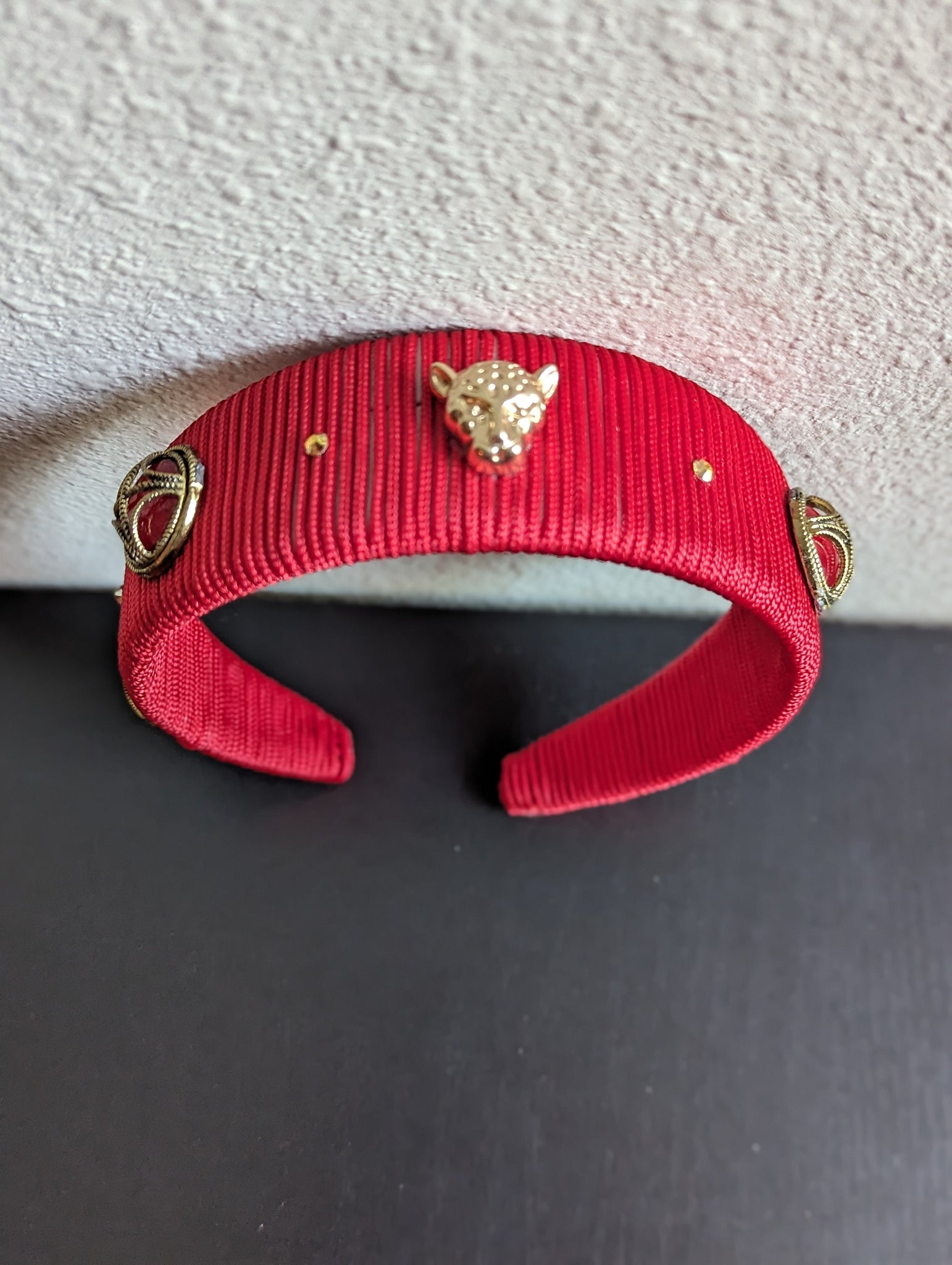 A Red Beaded Headband with Gold Tone Leopard is a bold and glamorous hair accessory that combines the richness of red beads with the opulence of gold accents.