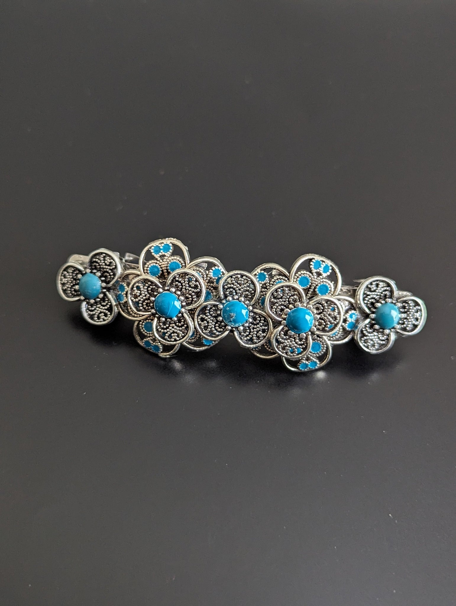 This lovely vintage style barrette is create for mature Women. Designed with metal flower findings and a touch teal to finish the look.
