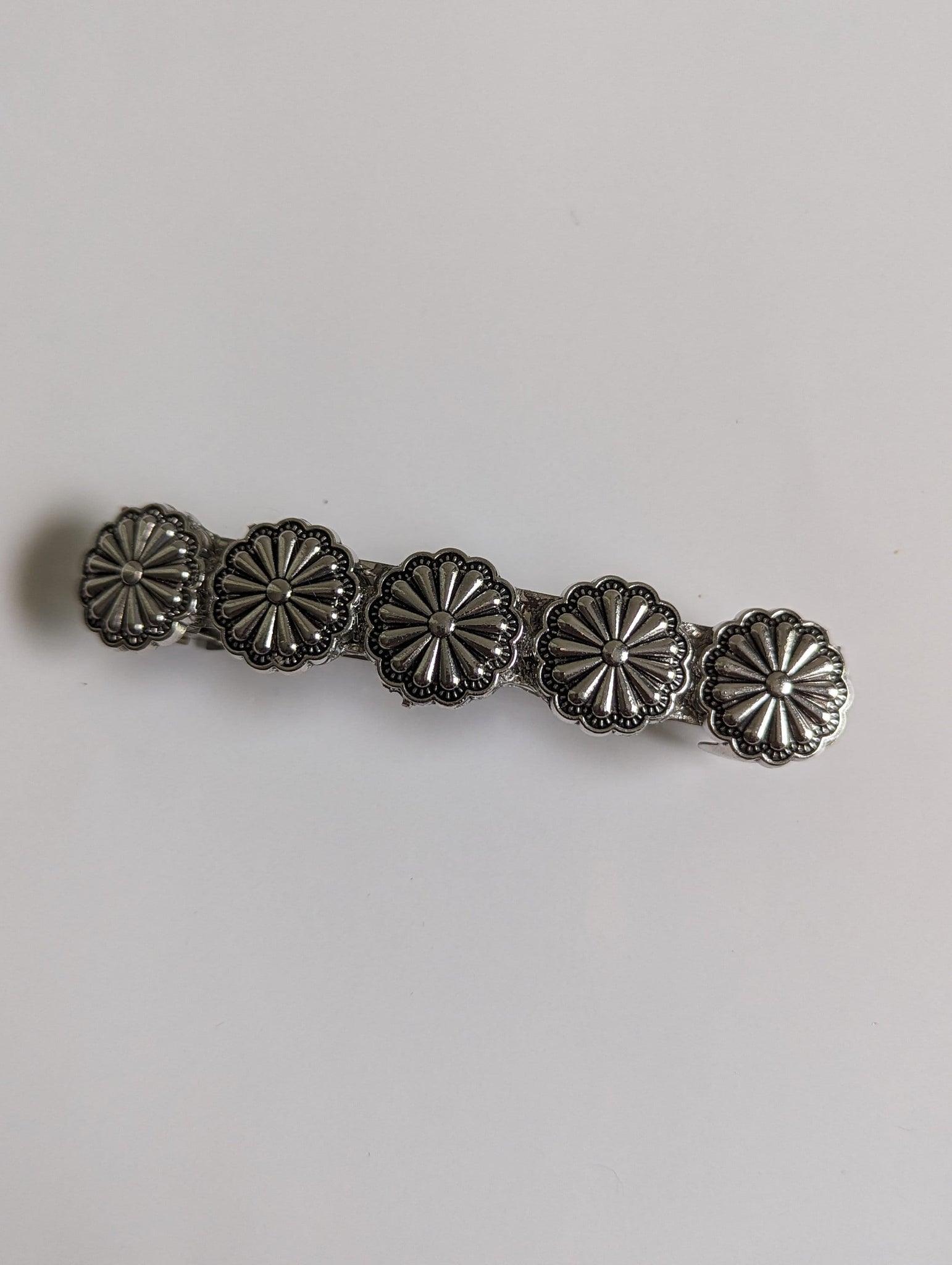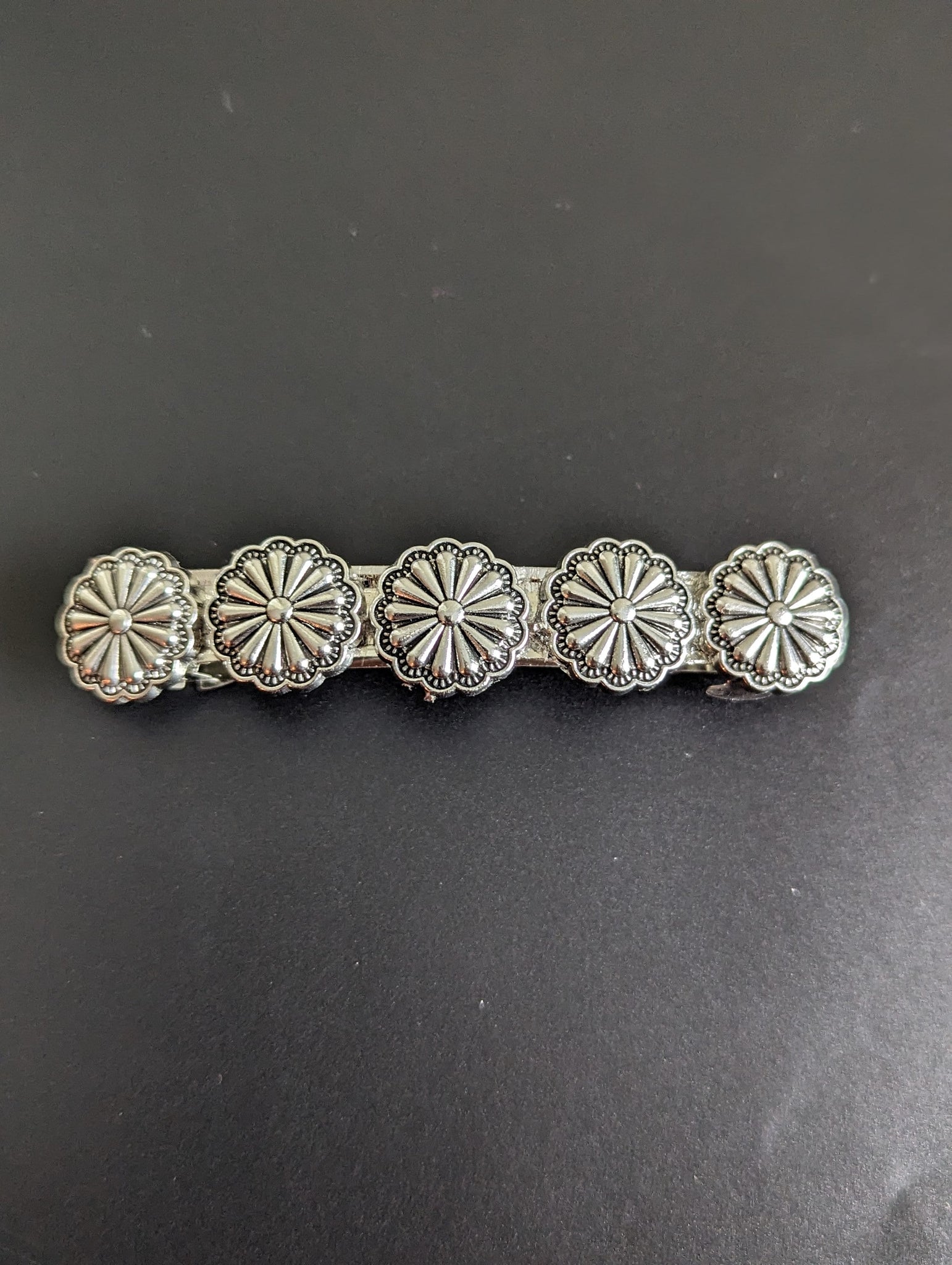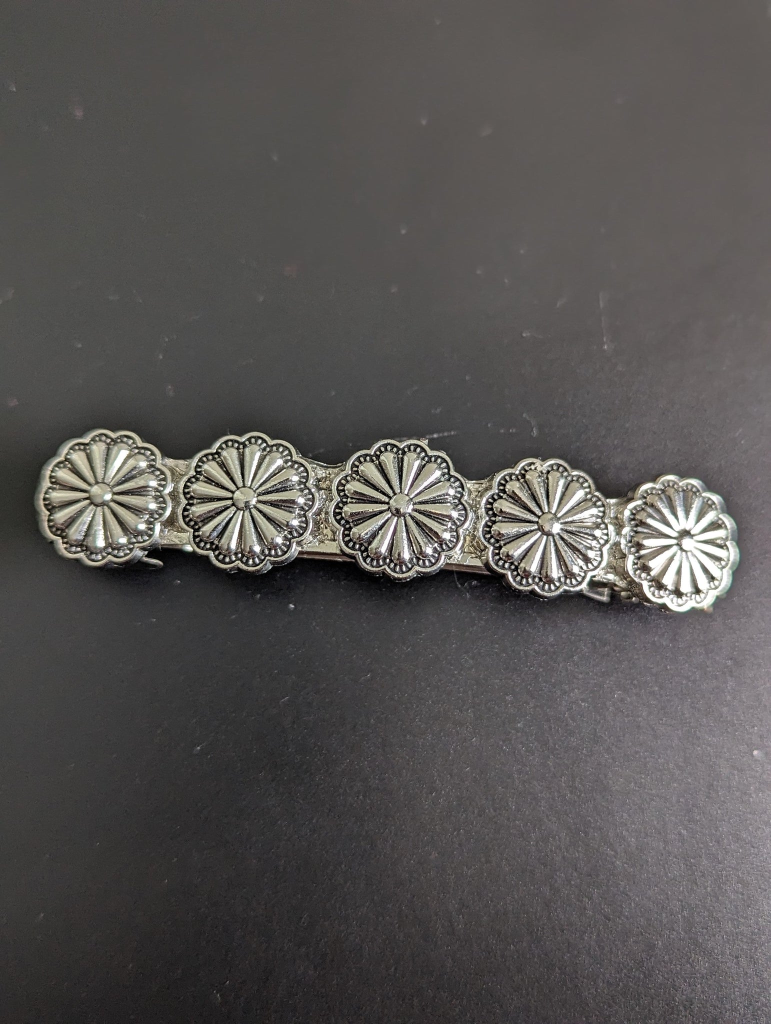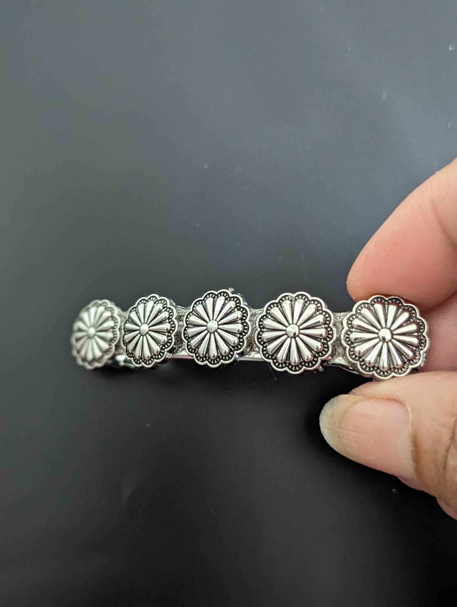 A silver Concho hair barrette is a stylish and versatile accessory designed to secure hair in place while adding a touch of Southwestern flair. The barrette typically features a Concho, a decorative silver-plated or sterling silver ornament often adorned with intricate designs such as Native American motifs, floral patterns, or geometric shapes. The Concho is attached to a sturdy metal clip or clasp, allowing it to easily grasp and hold sections of hair securely. These barrettes are both functional and fashionable, perfect for adding a subtle yet eye-catching accent to various hairstyles, from casual to formal.