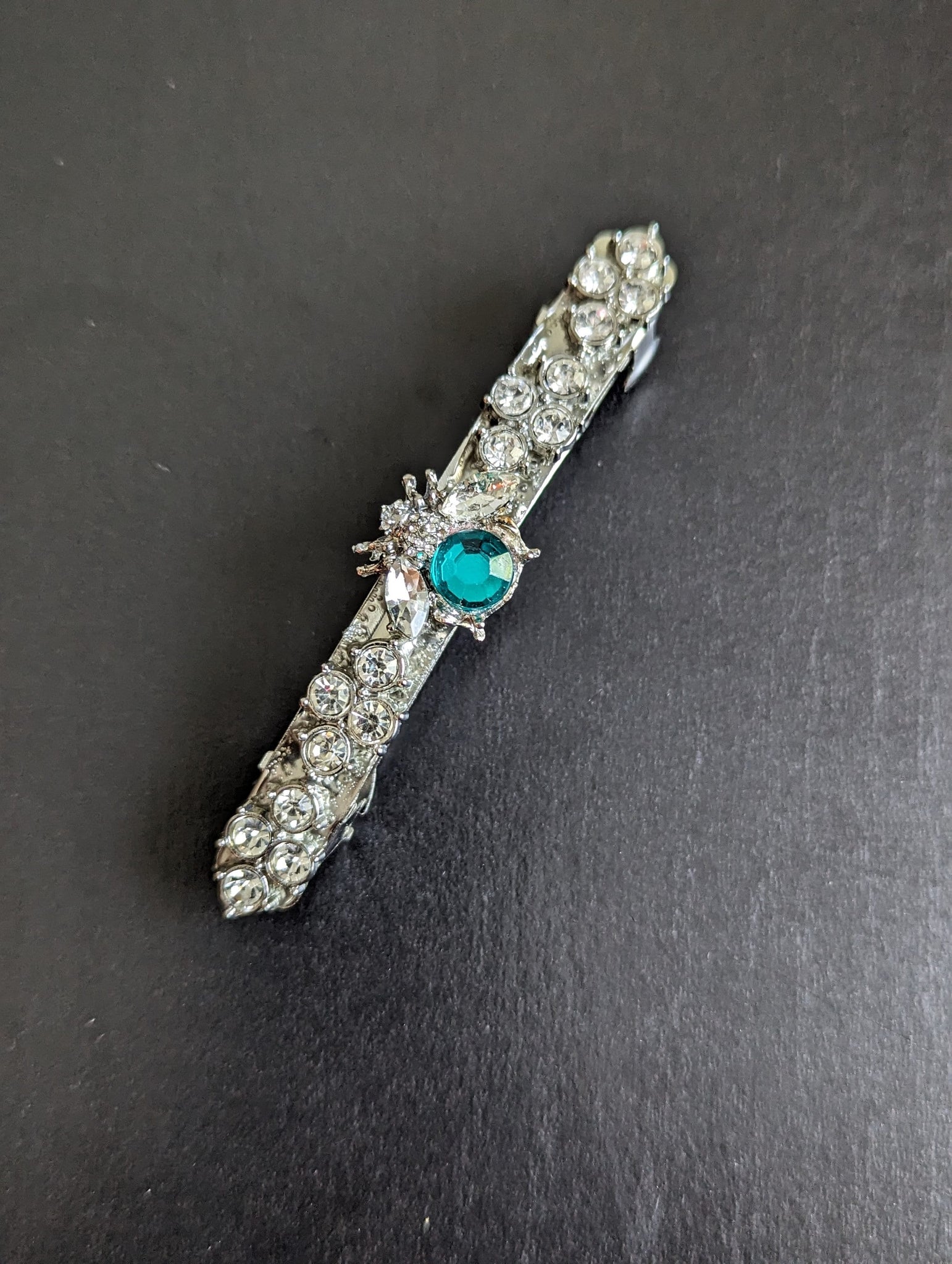 This beautiful Barrette features a single clear rhinestone bumble bee with a emerald gem center, surrounded by sparkling clear rhinestones.