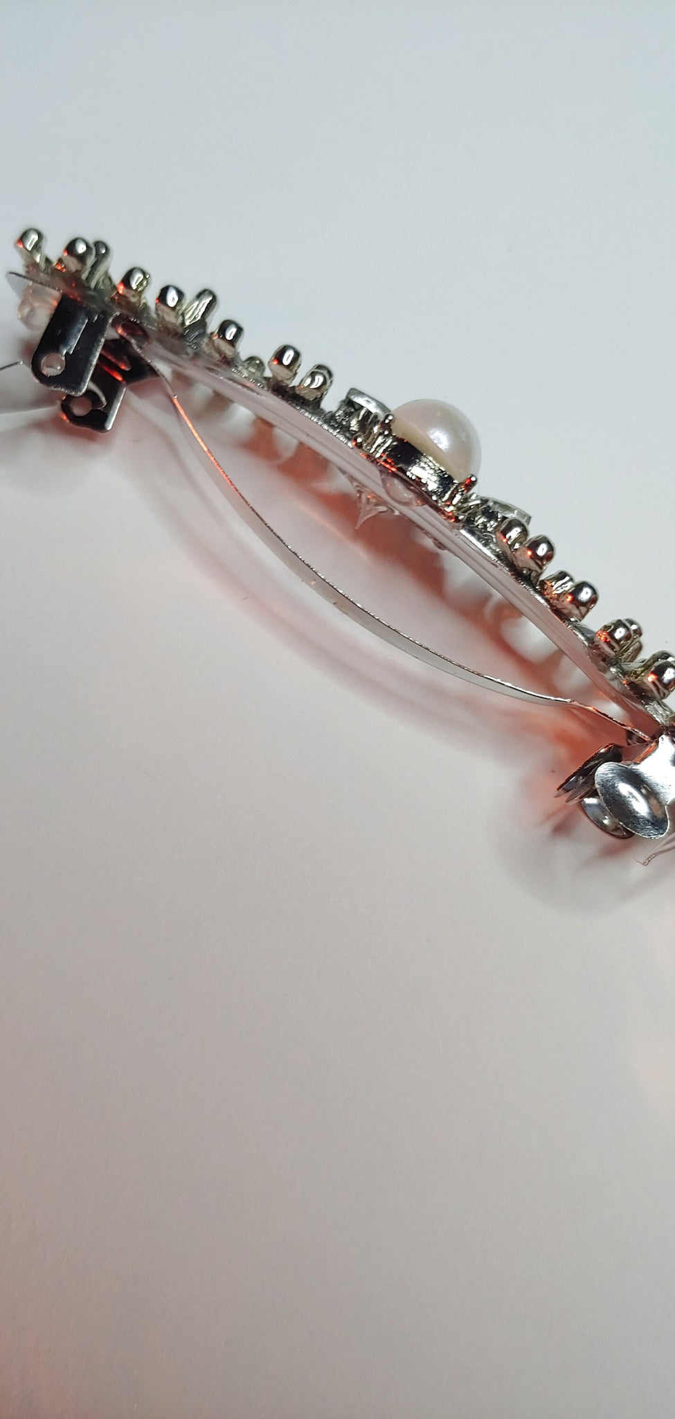 This unique barrette is designed with a pearl and rhinestone bumble bee surrounded by metal bars. This barrethe is 3 inches long.
