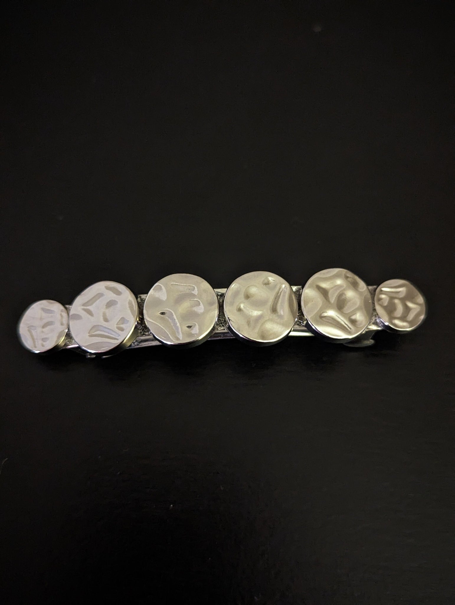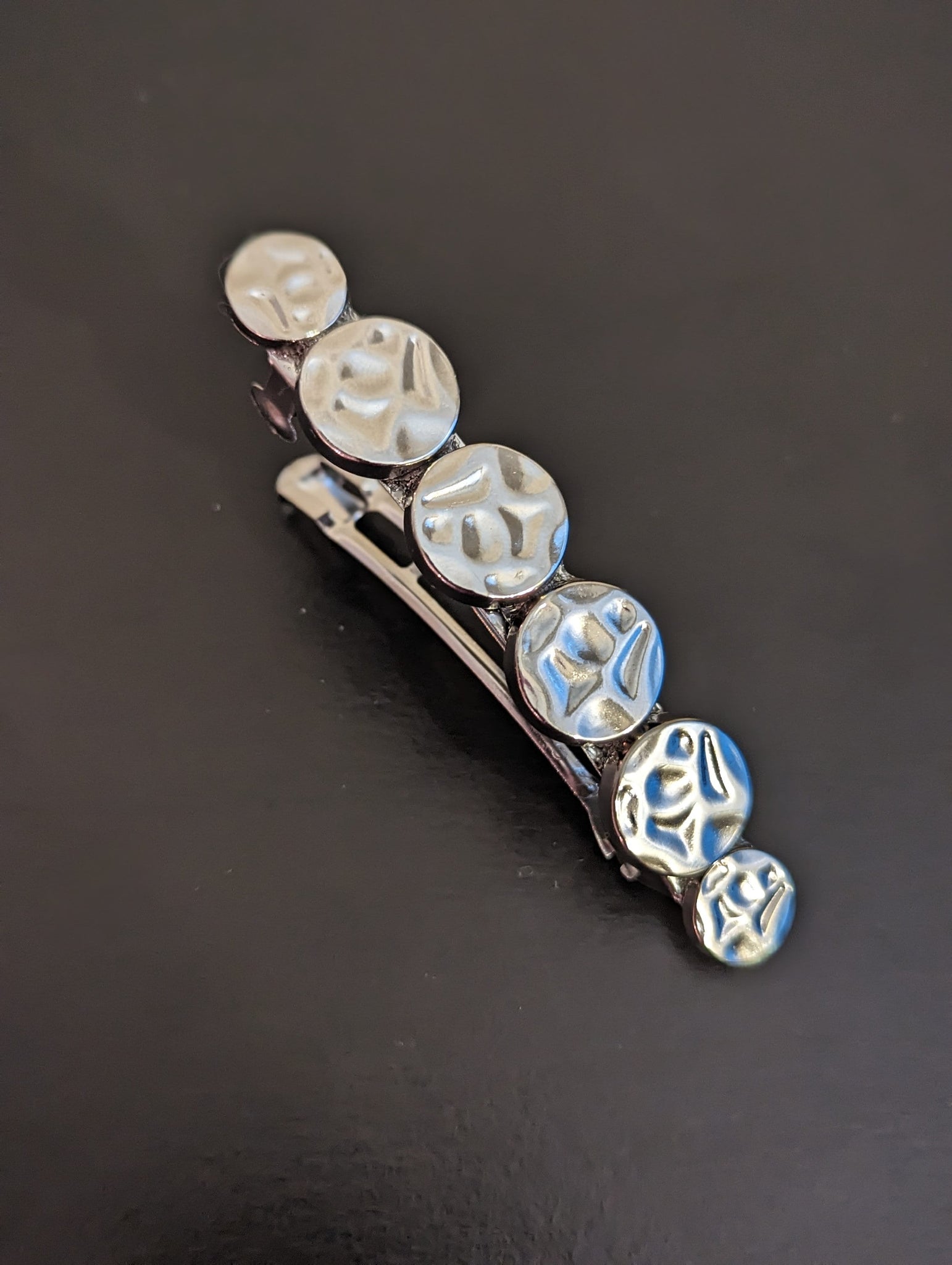 Material: Crafted from high-quality silver-toned metal, the barrette boasts a polished and reflective surface. The metal is shaped into a round disc, adding a touch of sophistication to the accessory.