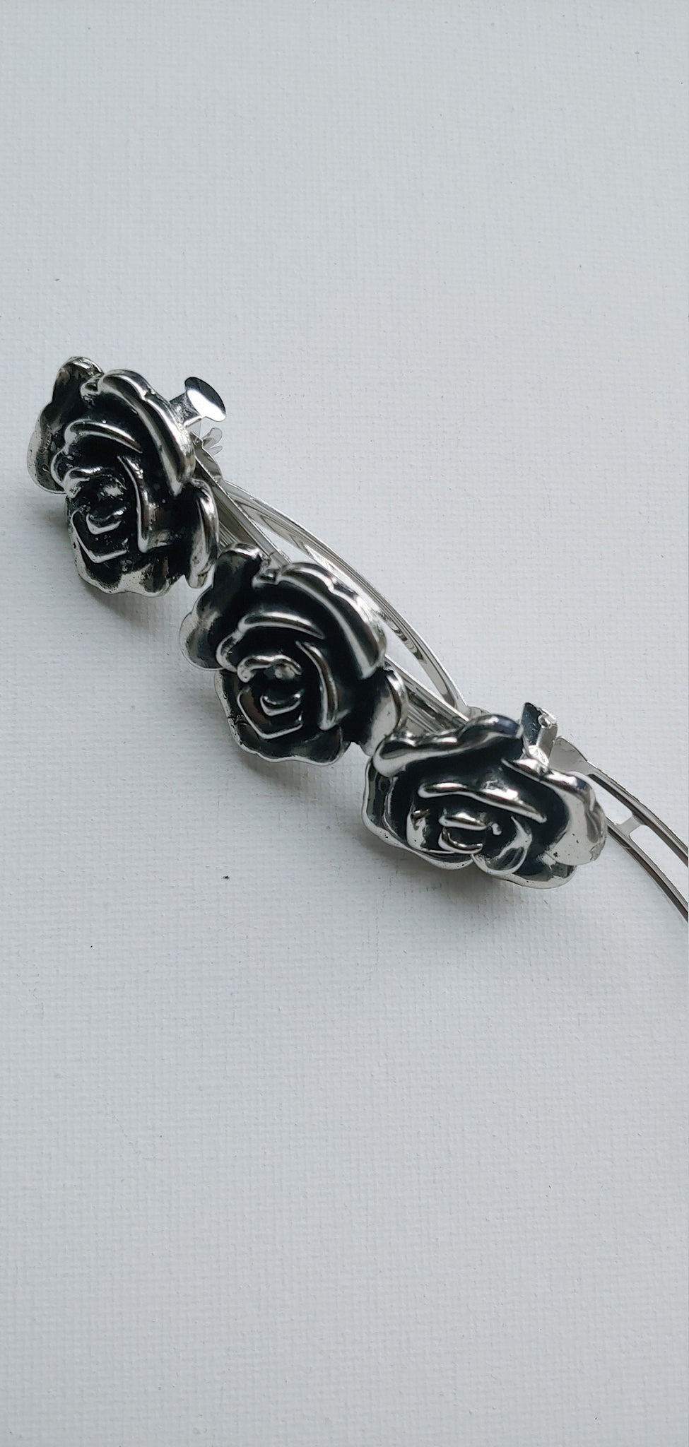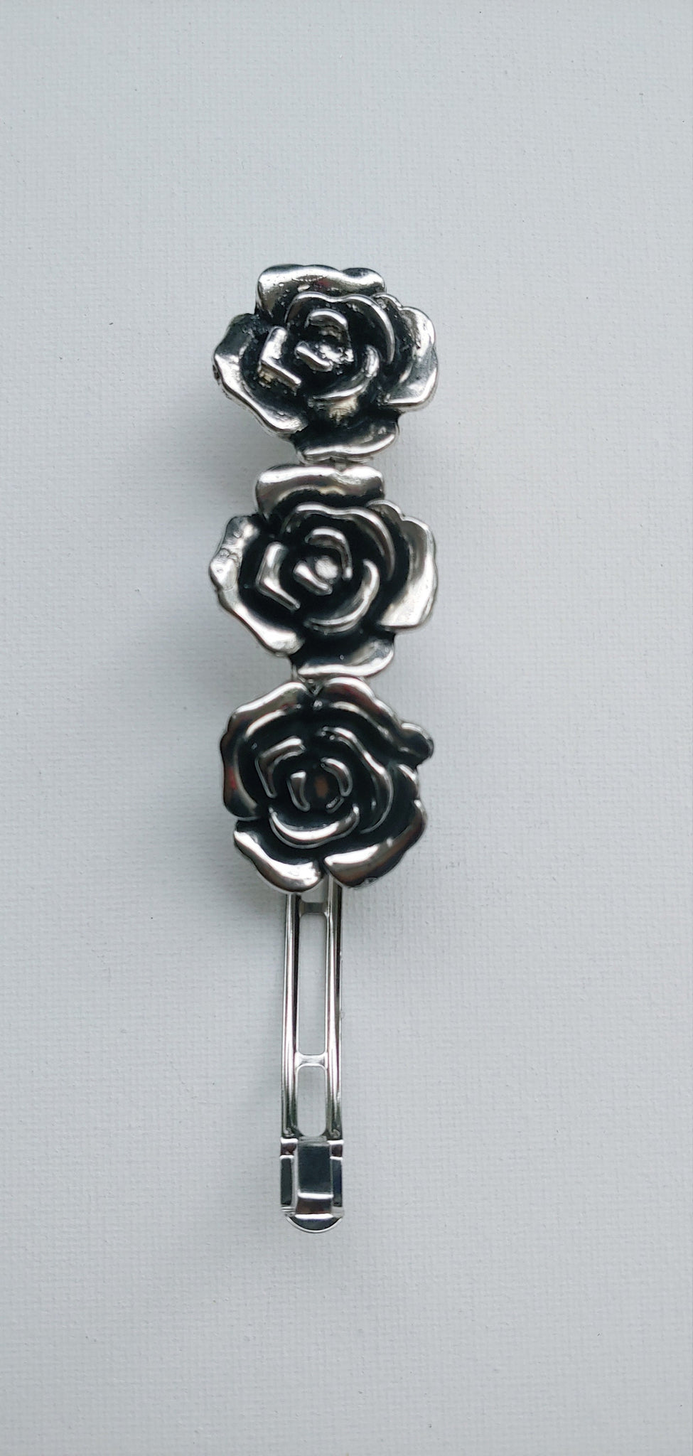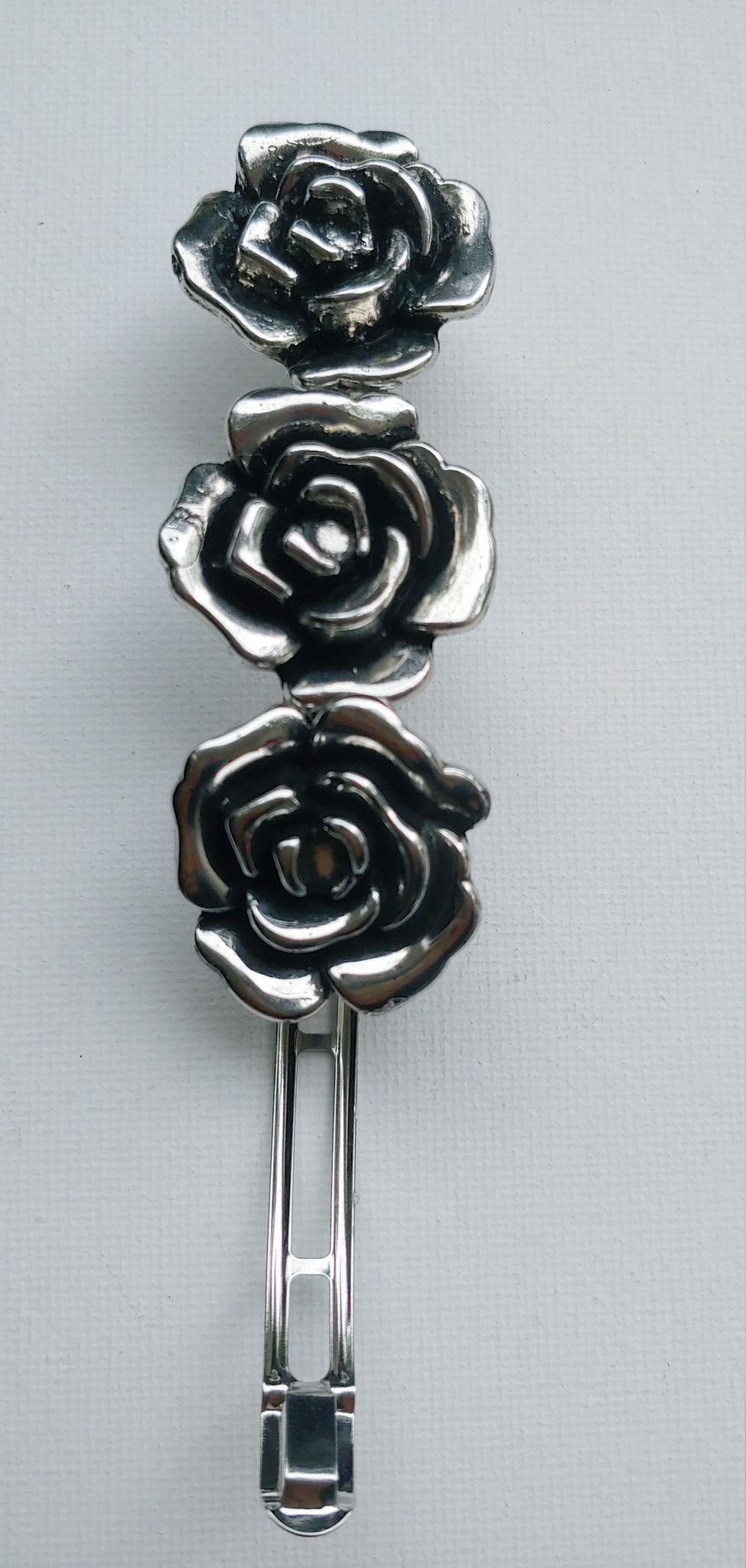 This metal barrette is designed with three large silver acrylic beads mounted on a 3 inch barrette.