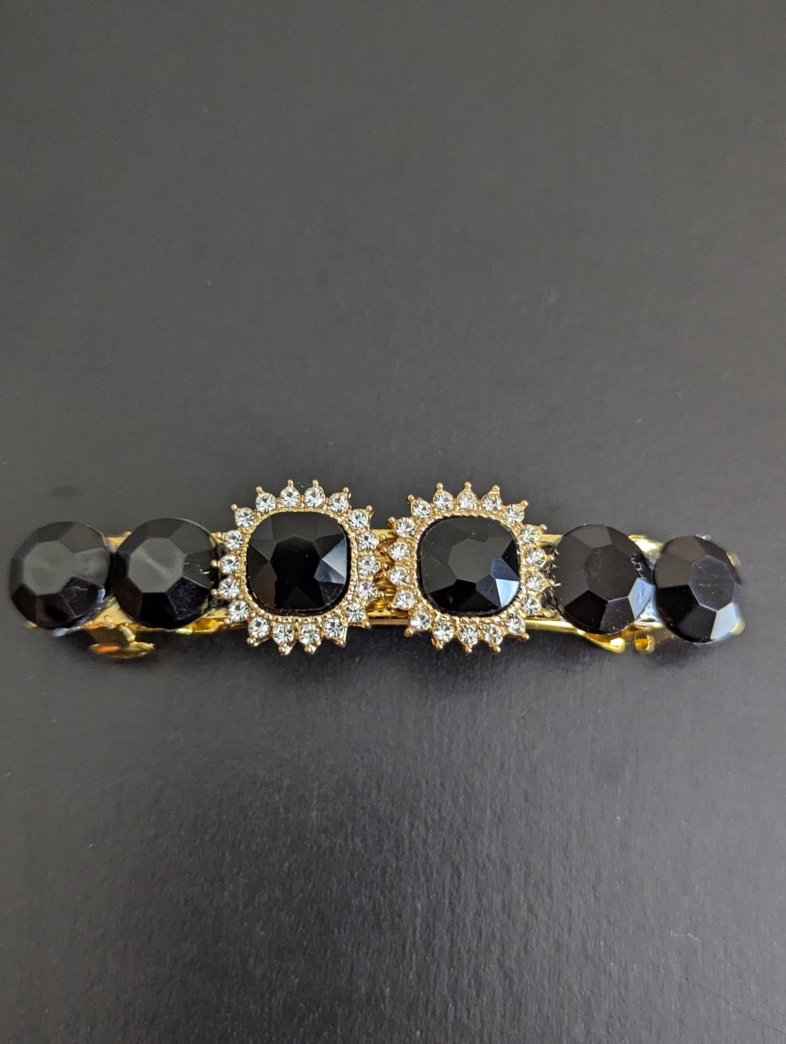Adorning the gold-tone base are exquisite black crystal rhinestones that catch and reflect light, creating a mesmerizing play of shimmer and shine. The rhinestones are carefully arranged along the barrette, adding a touch of glamour and sophistication to your hairstyle.