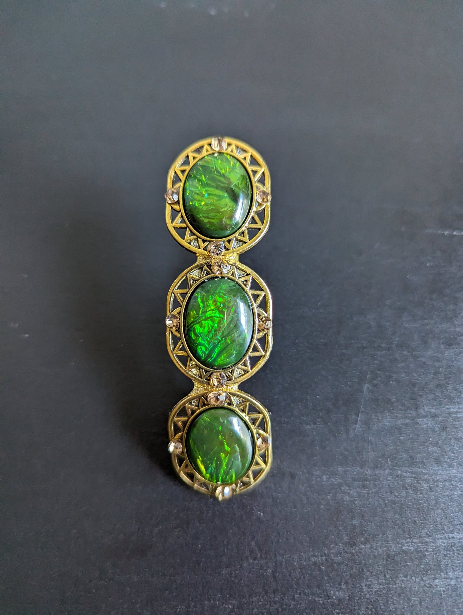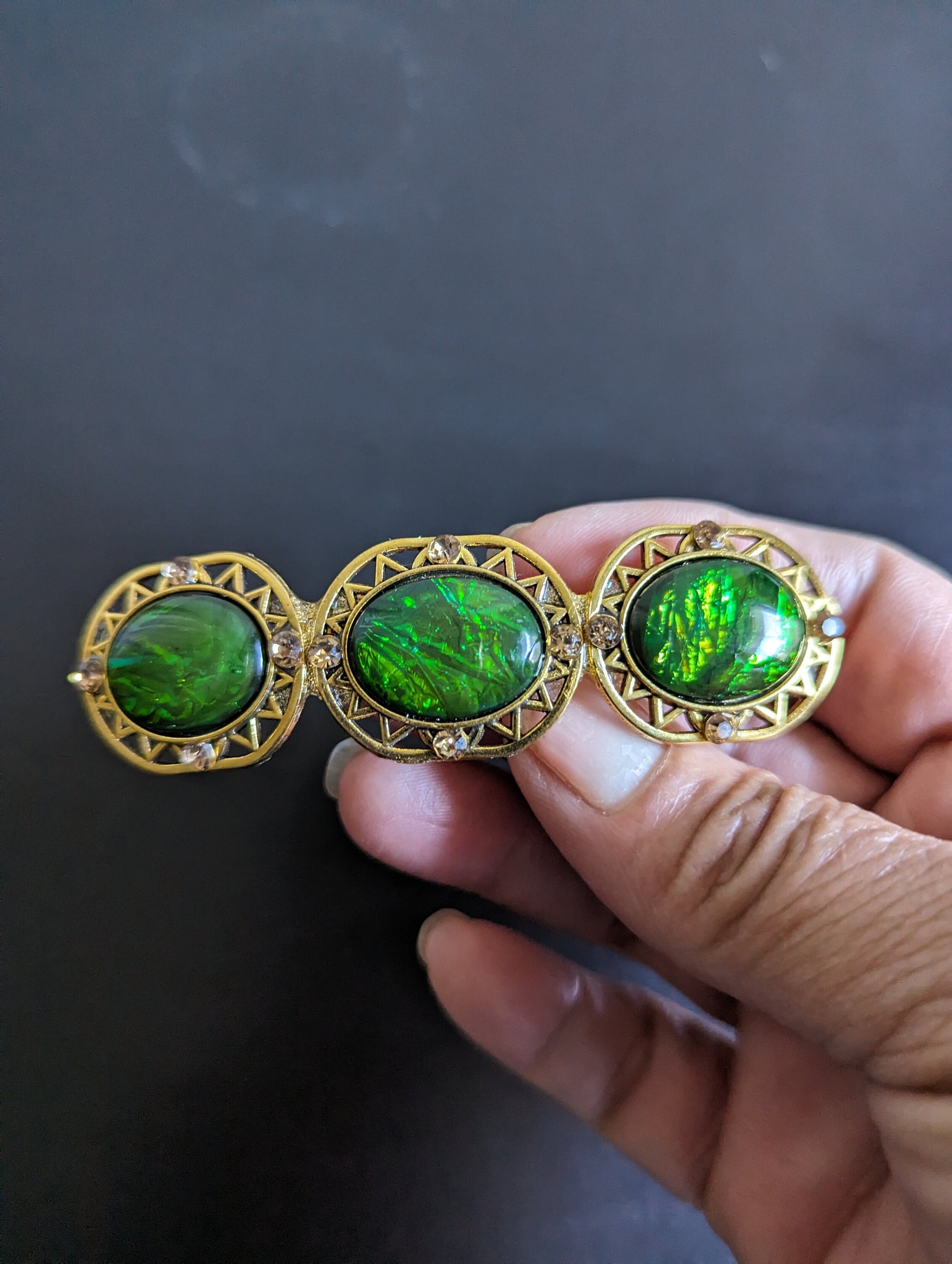 This 3-inch barrette was beautifully designed with three emerald stones encased in metal frames, mounted on a French metal barrette.